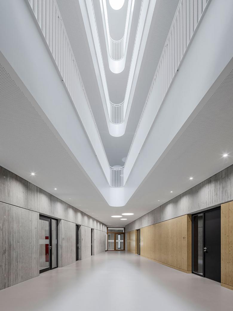 Die vier Jahrgänge befinden sich als zusammenhängende, überschaubare Cluster im dritten und vierten Obergeschoss. Erdgeschoss und erstes Obergeschoss nehmen die Ganztagesbetreuung und den Verwaltungs-/Lehrerbereich auf. Alle Geschosse sind räumlich über zwei viergeschossige Hallen miteinander verbunden, die Tageslicht in die Innenbereiche bringen.