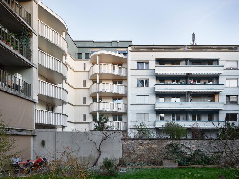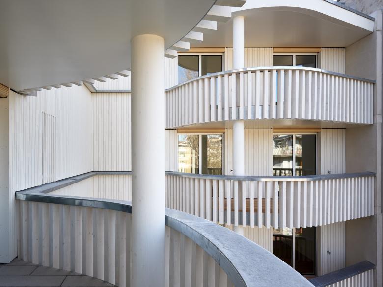 Das vorliegende Projekt markiert die nördliche Ecke des St. Johann-Platzes im Übergang zur Elsässerstrasse und zum St. Johann-Park. Diese städtebaulich wichtige Ecke im Gründerzeit-Blockrand wird über einen differenziert gegliederten Baukörper mit einem präzise gesetzten auskragenden Erker besetzt. Auf der Strassenseite zeigt sich der helle Baukörper als mineralisches Volumen, während er am Dach und im Hof als gegliedertes holzverkleideter Körper in Erscheinung tritt. Die französischen Fenster sind zur Strassenseite über kräftige Geländer charakterisiert und hölzerne Storen zeichnen die gut propotionierten Öffnungen zusätzlich aus, während auf der Hofseite plastisch entwickelte Balkone die besondere innenliegende Ecksituation auszeichnen. Die insgesamt 14 Wohnungen werden durch eine Espressobar und ein Wohnatelier im Erdgeschoss ergänzt, welche mit ihren Nutzungen den Anschluss an den öffentlichen Raum leisten.
