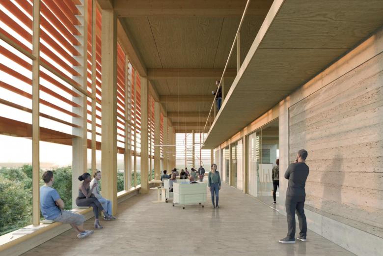 Das Doppelgeschoss der zusammenhängenden, öffentlichen Erdgeschosse bildet den einladenden Entreebereich des Hauses. Über Zugänge von der „Academic Mile“, der Eschenallee und der Campuswiese ist dieser Bereich vielfältig angebunden und öffnet sich zu einem großzügigen Innenhof. Dieser wiederum verbindet räumlich das ebenfalls öffentliche Galeriegeschoss im Dachgeschoss. Zwischen diesen beiden offenen Zonen liegen drei halböffentliche Institutsgeschosse, die zum Innenhof hin verglast sind und über eine niederschwellige Zugangskontrolle verfügen. So entsteht eine ausgewogene Balance zwischen Offenheit und konzentriertem Arbeiten.