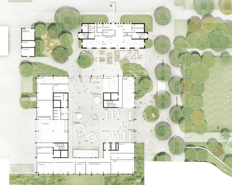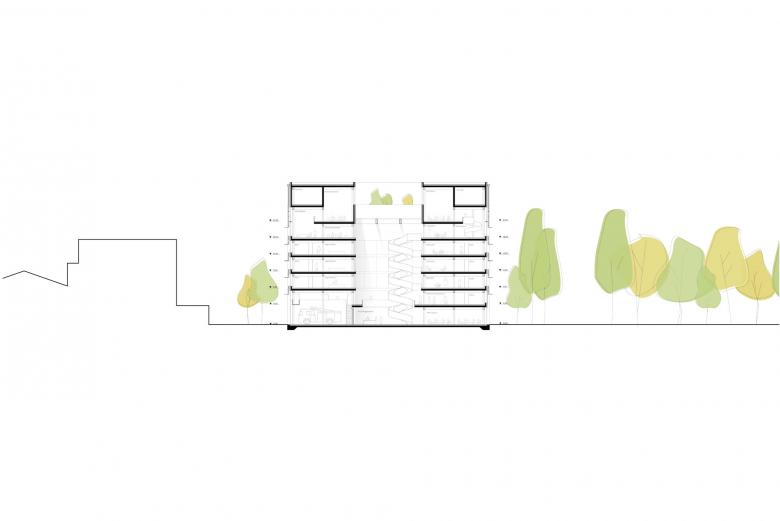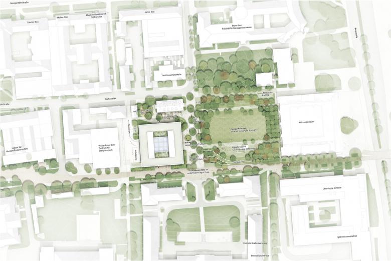 Die architektonische Anmutung des Gebäudes ist geprägt durch eine filigrane Fassadengestaltung sowie zwei mit dem Freiraum verknüpfte Eingangsebenen. In den beiden Dachgeschossen öffnet sich eine flexible und transparente Arbeitslandschaft, die Begegnung, Austausch und innovative Zusammenarbeit fördert. Durch die städtebauliche Neustrukturierung des Areals ergibt sich die Chance, ein zukunftsweisendes Ensemble zu schaffen, das nicht nur funktional überzeugt, sondern auch als grüner Trittstein in das Stadtgefüge hineinwirkt.