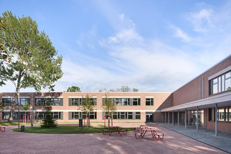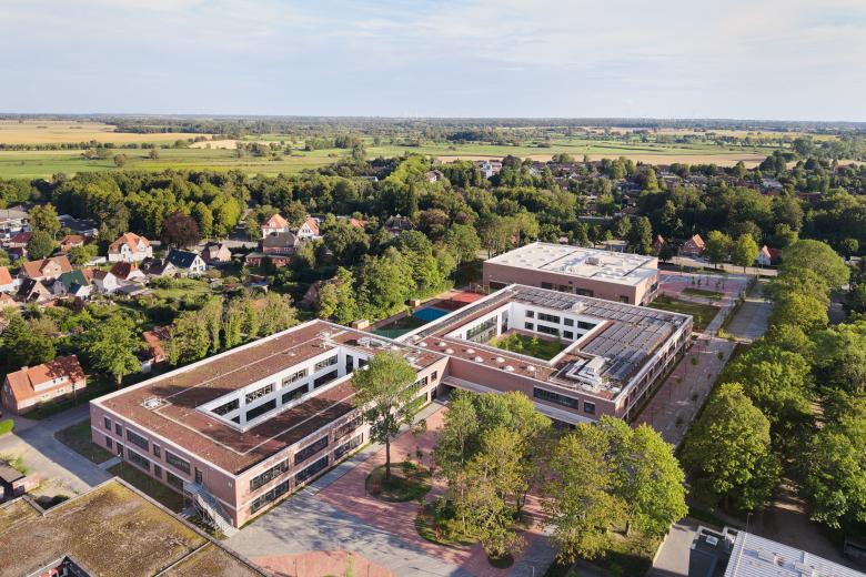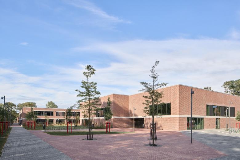 Aufgereiht wie an einer bewegten Perlenkette folgen die Neubauten für das Gymnasium und die Gemeinschaftsschule in Oldenburg der Typologie des aus den 1970er Jahre stammenden Hauptgebäudes: Ein zweigeschossiger roter Klinkerbau, der seinen introvertierten Charakter durch einen großzügigen Innenhof erhält und durch offene, klare Grundrisse überzeugt.