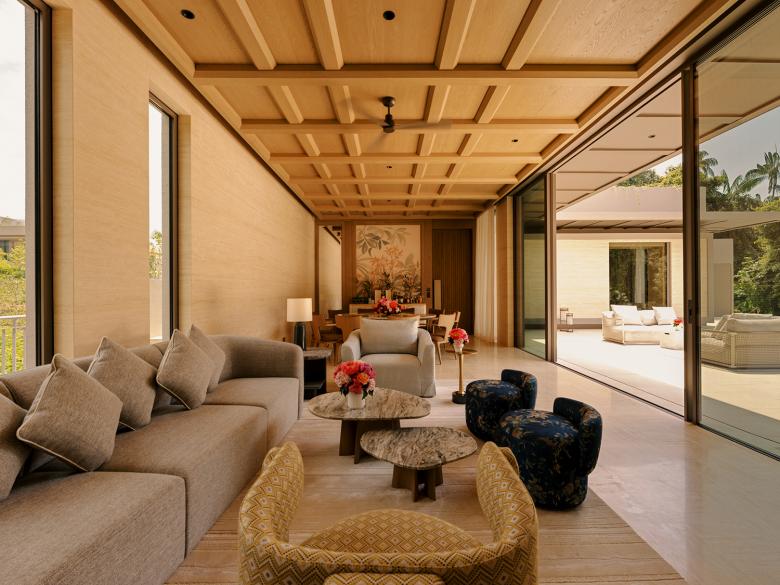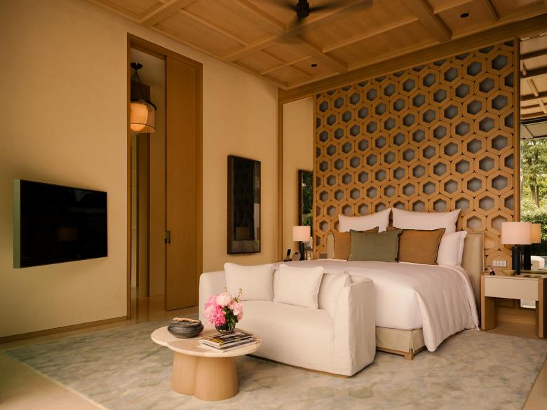 Die vom internationalen Designstudio Yabu Pushelberg verantwortete Gestaltung folgt einem organischen Grundriss, der die Gäste vom Empfang über die gemeinschaftlichen Bereiche bis zu den privaten Villen führt. Dabei taucht man mit jedem Schritt tiefer in die grüne Umgebung ein. Die Architektur verbindet klare Formen mit natürlichen Materialien. Travertin, helle Hölzer und handwerkliche Details prägen das Erscheinungsbild. Die Farbpalette ist zurückhaltend gewählt: Beige, Sand, Steingrau und helle Brauntöne dominieren. In Kombination mit maßgefertigten Möbeln und Kunstwerken lokaler Künstler entsteht eine ruhige, beinah private Atmosphäre. Große Glasflächen öffnen die Räume zum Garten. Jedes Gebäude ist als abgeschlossene Einheit mit eigenem Pool und Terrasse geplant. Die Übergänge zwischen Innen- und Außenbereich sind fließend. Textile Elemente, Lichtreflexionen und der Blick ins Grüne schaffen eine Atmosphäre, die sich konsequent den Themen Rückzug und Entschleunigung widmet.