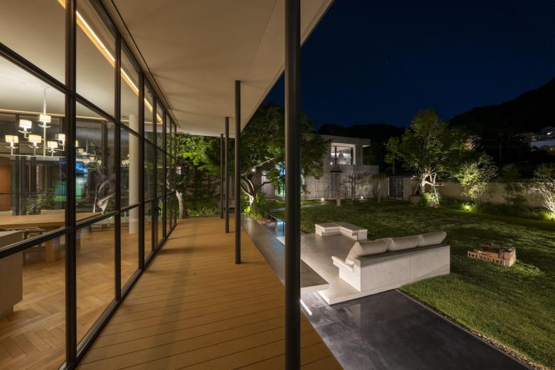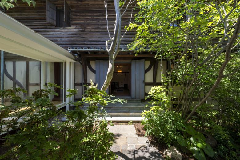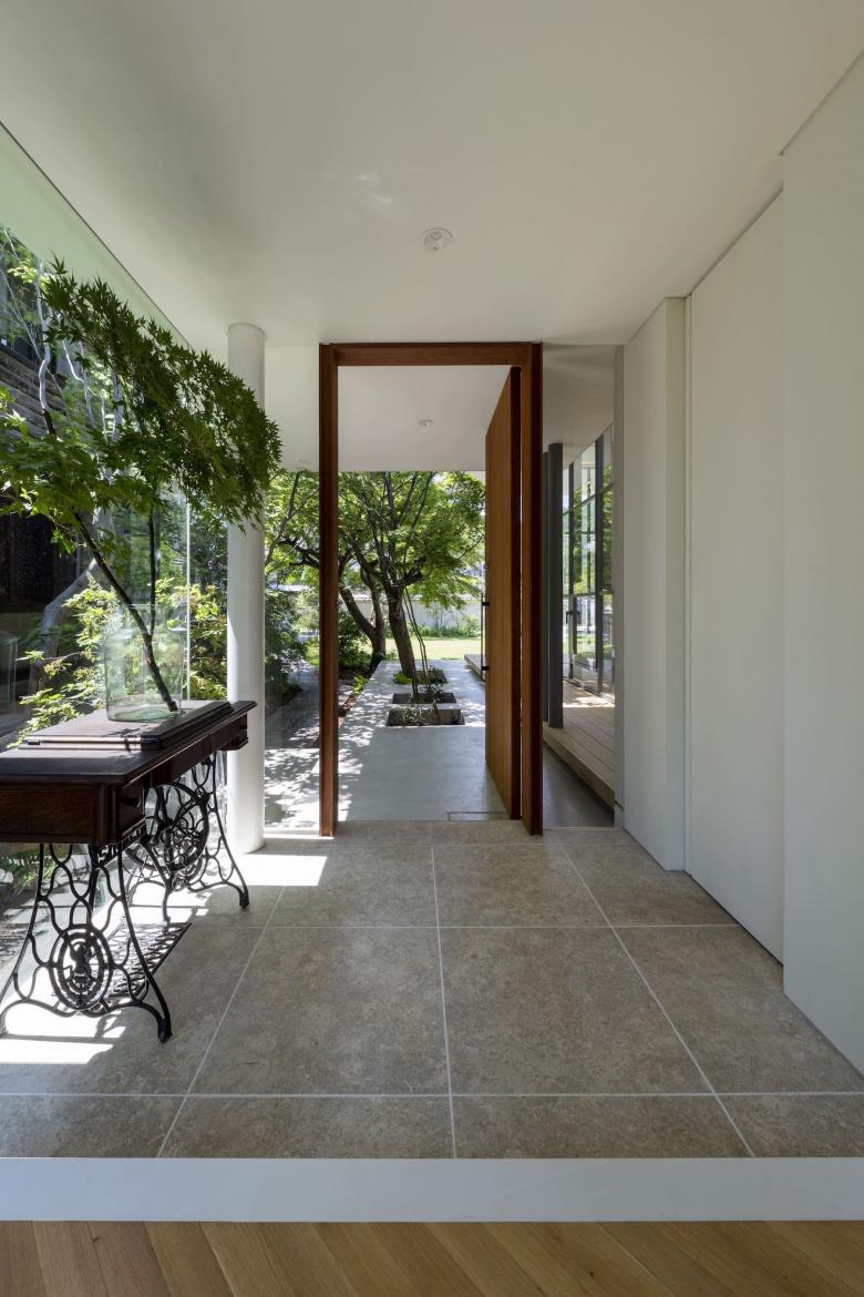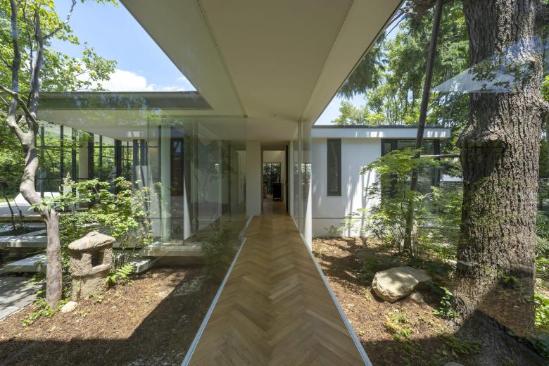 Approaching the gate, glimpses of the main house appear intermittently as one walks along the approach paved with Teppei stone, flanked by lamp posts and dogwood trees. Beyond this, one passes through a tunnel of Japanese maples and small-leaved maples, which turn crimson in autumn, arriving at the entrance to the main house and storehouse, connected by a glass-walled corridor. The view extends through the glass to the inner courtyard, where vibrant autumn foliage of dogwood and a towering Himalayan cedar, serving as a symbolic landmark, greet visitors.