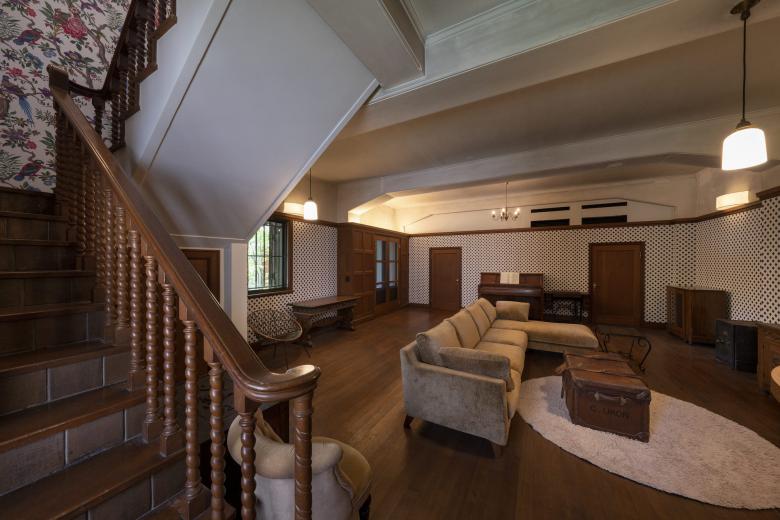 The main living-dining-kitchen area in the main house features a ceiling height of 3.2 m, accommodating the owner's stature. Slim, sharply edged lattice windows face the garden and storehouse, creating an open space where one can enjoy the garden while sensing the presence of the historic storehouse. The guest house, which also serves as a car park, includes a golf room for spending time with friends. This section is also designed to face the main house and storehouse, creating a harmonious relationship between the buildings. The garden features only the remains of an air-raid shelter, with no other large structures, allowing children to play freely. The renovation avoided major structural alterations, preserving the original design and the accumulated patina of time.