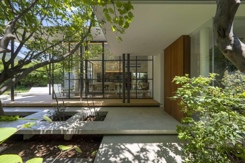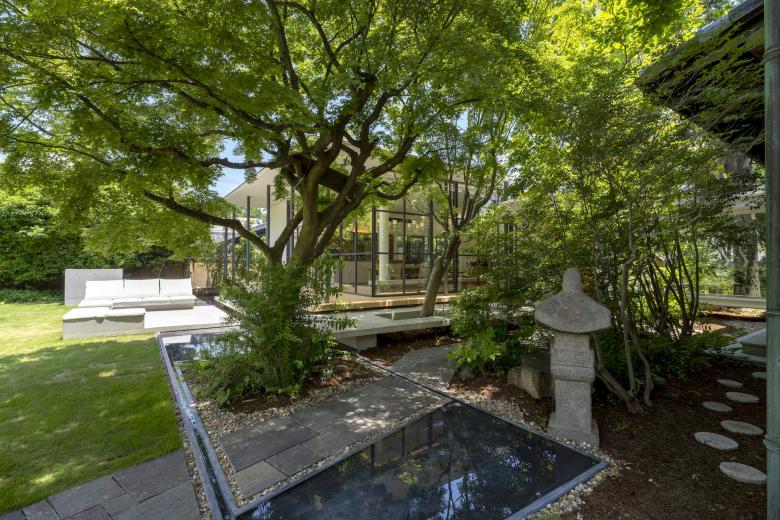 The site is situated in a tranquil residential area along the Ashiya River, overlooking Mount Rokko to the north and the Seto Inland Sea to the south, with the welcoming pavilion designed by Wright also visible.Within the grounds stands a modernist pine tree planted in 1927, which the plan from the outset was to preserve rather than remove.