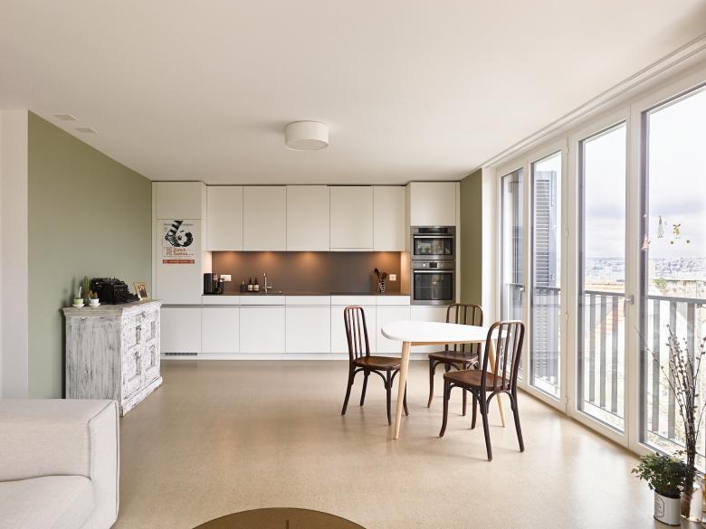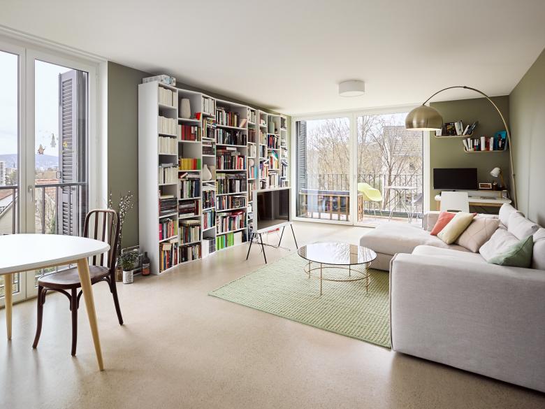 Im Inneren sind die Wohnungen lichtdurchflutet und effizient organisiert. Offene Grundrisse schaffen fließende Übergänge zwischen Wohn- und Rückzugsbereichen. Grosszügige Fenster rahmen Ausblicke ins Grüne und stärken die Verbindung zur Umgebung.