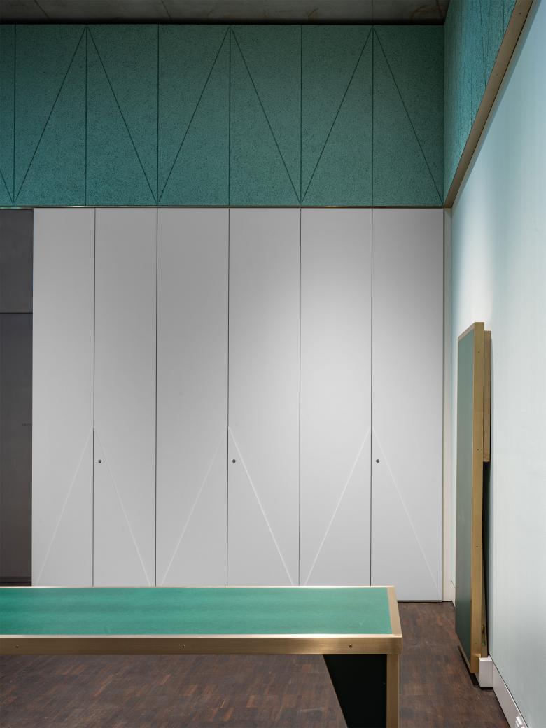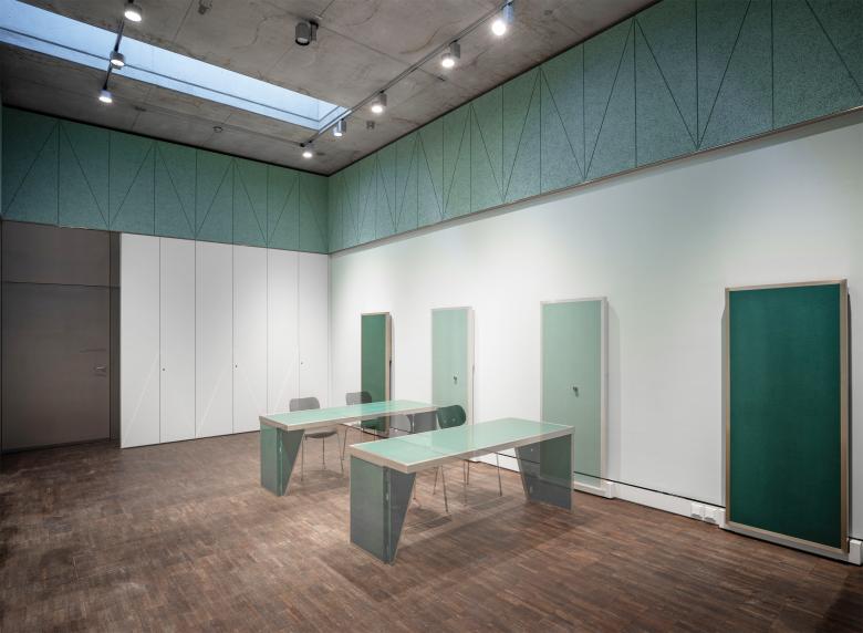 Auf den Längsseiten des Raums wurden sondergefertigte Tische angeordnet, die bei Bedarf nach oben geklappt werden können, sodass die Fläche für andere Veranstaltungszwecke zur Verfügung steht. Das Schrankelement zur Unterbringung des Vermittlungsmaterials wurde auf dem verbleibenden Wandstück neben der Tür zum Fluchttreppenhaus vorgesehen. Die gegenüberliegende Querwand dient als Projektionsfläche. Akustisch wirksame Wandpaneele bilden den oberen Wandabschluss und verbessern die Sprachverständlichkeit und Schalldämpfung im Raum.