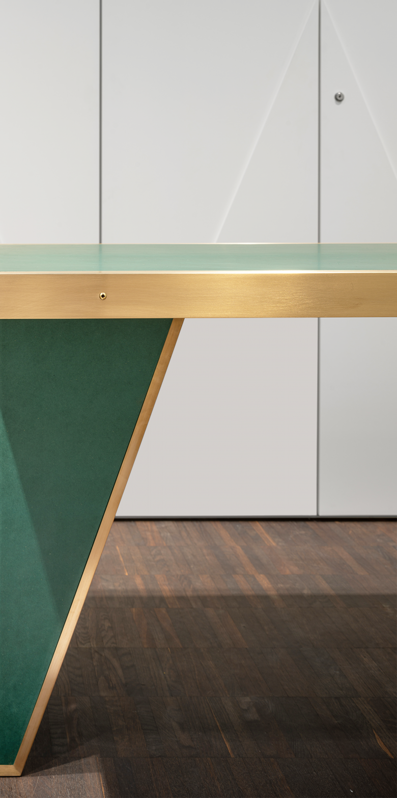 Diagonale Linien ziehen sich als Gestaltungselement durch die Raumneugestaltung. Abgeleitet aus dem Gestaltungskonzept wurden die Akustikpaneele mit einer diagonalen Nut gefertigt. Auch für künftige Projekte stellt die Firma dieses Detail nun bereit.