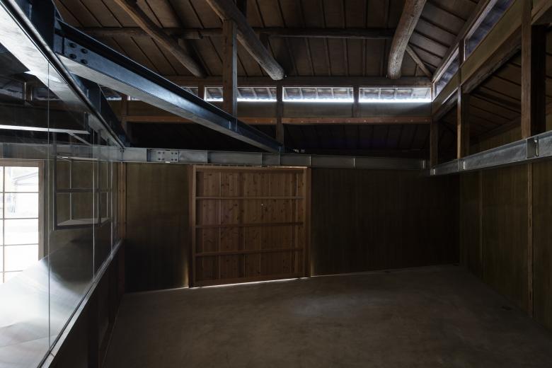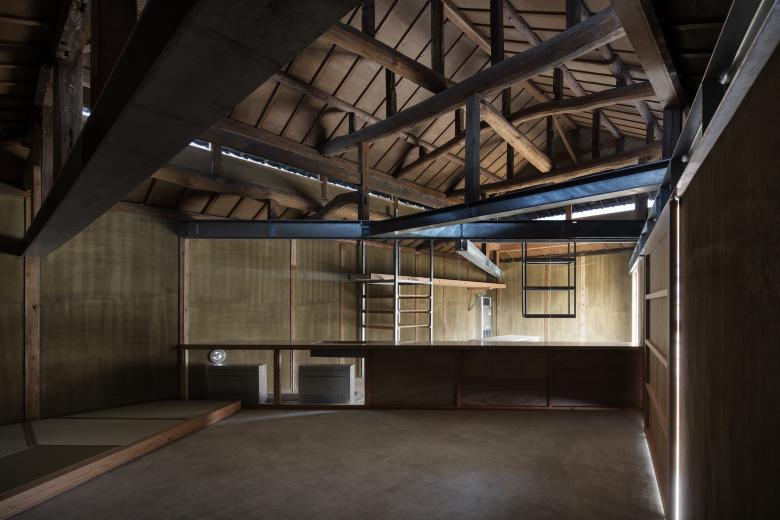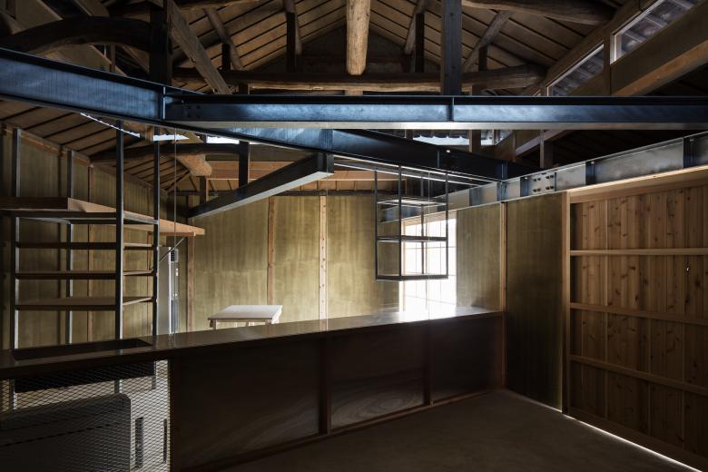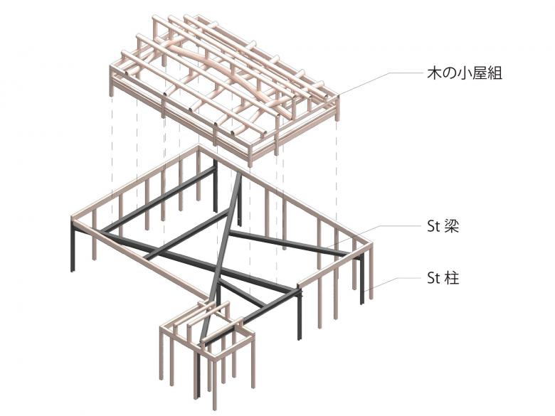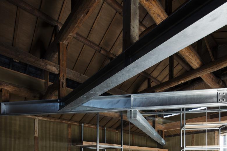 そこで私たちは、大断面の鉄骨梁によって、空間に落ちる木の柱を全て中空で支え、小屋組を残したまま無柱の空間を出現させました。鉄骨の梁はラボの名にも相応しいようあえてそのまま露出させることで、迫力ある小屋組に負けない存在感を放っています。