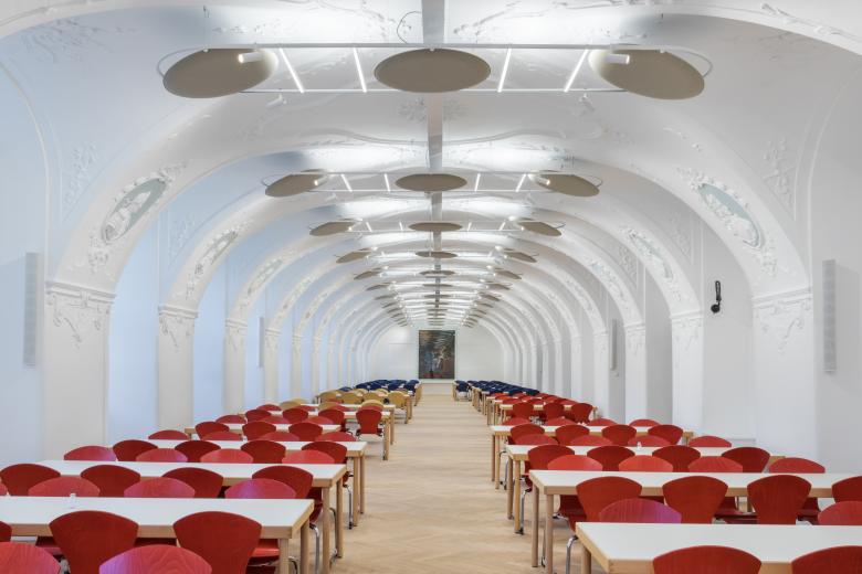Der große Speisesaal wurde im 17. Jhdt. errichtet und beeindruckt mit seiner Architektur und den aus dem 18. Jhdt. stammenden gerahmten Porträtköpfe. Mit seinen ca. 180 Sitzplätzen finden Kinder vom Kindergarten, der Volkschule, des Gymnasiums und des Internats Platz. Aufgrund der Raumgeometrie (ca. 42 M lang, ca. 6,7 M breit, ca. 4,5 M hoch, Gewölbe) ist die Bauakustik sehr ungünstig (langer Nachhall). Mit den eingesetzten Leuchten mit den Akustikelementen konnte der Nachhall deutlich reduziert werden, und die Bauakustik verbessert werden. Die Leuchten sind in jeder Fensterachse, deren Stichkappengewölbe mit dem Hauptgewölbe ein Kreuzgewölbe ausbilden, angeordnet. Eine Leuchte in einer Fensterachse besteht aus Insgesamt 4 direkt/indirekt Lichtbändern, 4 Spots und 3 Akustikelementen. Insgesamt sind 14 Leuchten über die ganze Saallänge angeordnet.