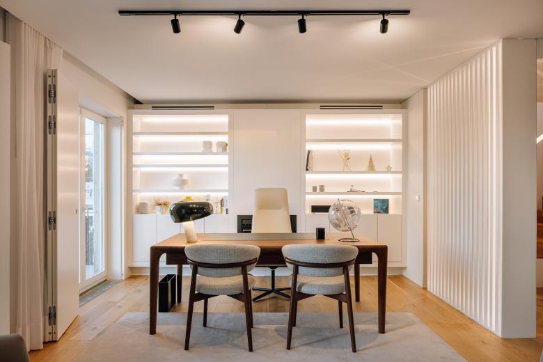 Ein neuer Anbau, der mit beweglichen Lamellen aus weiß lackiertem Aluminium verkleidet ist, ergänzt das ursprüngliche Gebäude und bringt Leichtigkeit in das Ensemble. Das Spiel aus offenen und geschlossenen Fassadenelementen erzeugt ein lebendiges Wechselspiel von Licht, Sicht und Privatsphäre. Die Materialwahl, darunter Naturstein, Holz und handgefertigte Fliesen, verleiht dem Haus Wärme und Zeitlosigkeit. Im Inneren wurde das Haus vollständig neu organisiert. Der Sockelbereich dient heute nicht nur praktischen Zwecken, sondern bietet auch Platz für ein Gästezimmer, ein kleines Schwimmbad und einen privaten Kinoraum. Darüber liegen großzügige Wohn- und Essbereiche, in denen sich die Räume fließend ineinander öffnen. Eine maßgefertigte Möblierung begleitet durch das gesamte Haus und bietet Stauraum an den Stellen, an denen er benötigt wird. In der oberen Etage befinden sich zwei Gästezimmer und eine großzügige Master-Suite mit Blick über den Tejo. Ein neu ausgebautes Dachgeschoss bietet zusätzliche Rückzugsorte sowie eine Dachterrasse mit weitem Panorama. Die Verbindung von Bestand und Erweiterung zeigt sich nicht nur in der Architektur, sondern auch in der Haltung: Respekt vor dem Vorhandenen und Offenheit für das Neue. Im gesamten Gebäude kommen Schalter und Steckdosen der Serie LS 990 von JUNG in der Farbe Alpinweiß zum Einsatz. Ihre klare Formensprache und hochwertige Ausführung fügen sich nahtlos in das reduzierte Interieur ein und ergänzen es sowohl funktional als auch ästhetisch.