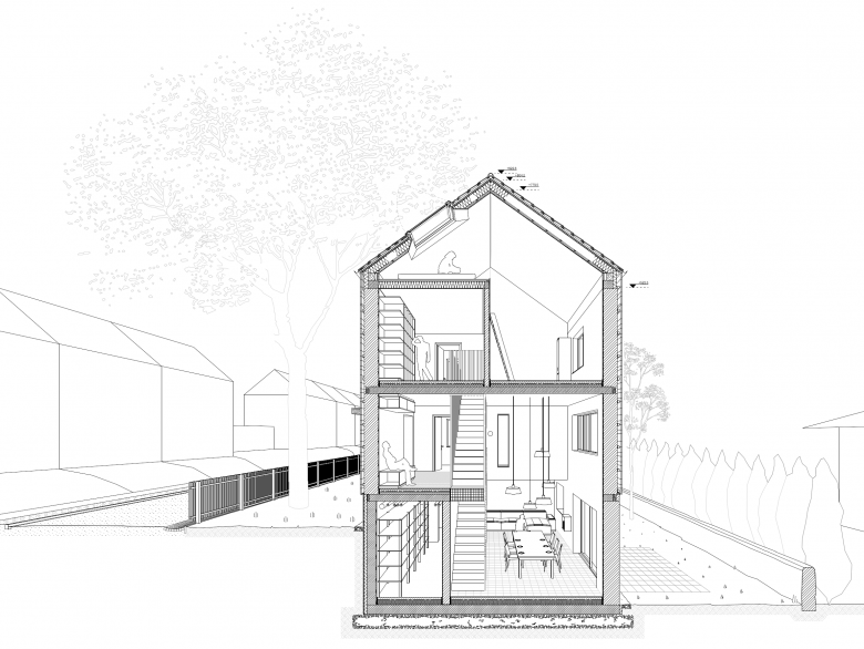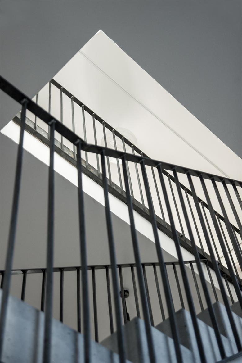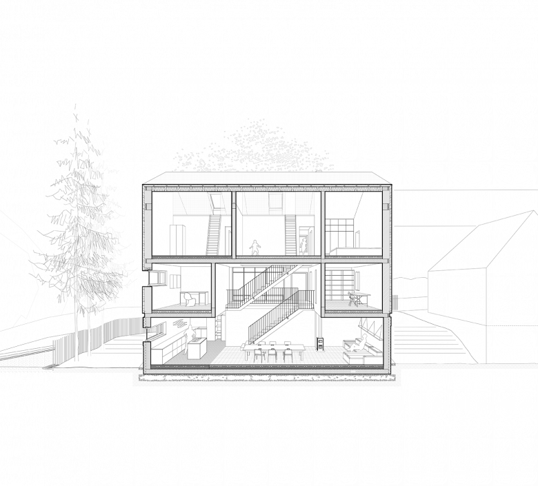 Erschlossen wird das 3-geschossige Haus von Osten. Auf der Eingangsebene befinden sich neben einem großzügigen Garderobenbereich Büro, Gästezimmer und Gästebad. Über eine Luftraum wird der Blick freigegeben in das Untergeschoss: der langgestreckte, offene Raum mit direktem Zugang in den Garten dient zum Kochen, Essen und Wohnen. Ein einläufige Sichtbetontreppe verbindet die Ebenen miteinander. Im Obergeschoss befinden sich die privaten Räume der Familie: Bad, Schlafzimmer und Kinderzimmer. Die Kinderzimmer verfügen jeweils über eine nach Osten ausgerichtete Galerie zum Spielen, Malen und Basteln. In Schlaf- und Kinderzimmern wird zudem die Form des flach geneigten Satteldaches deutlich spürbar.