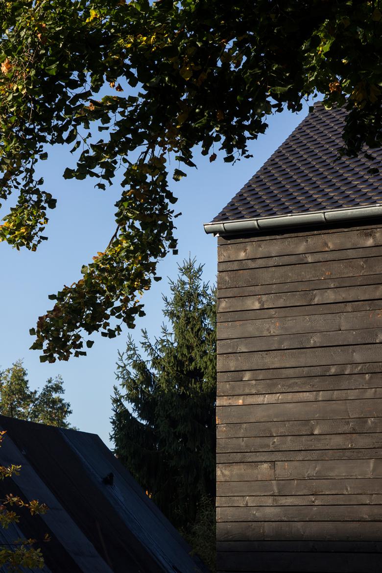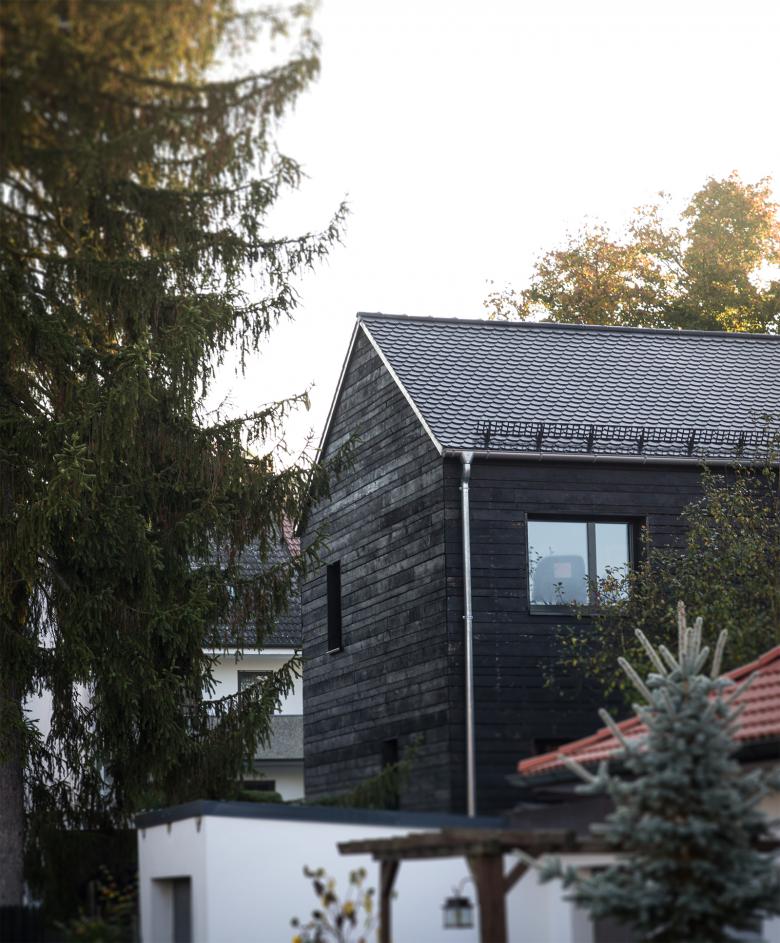 Von außen betrachtet fällt das Haus auf Grund seiner dunklen Fassade ins Auge. Diese besteht aus hinterlüfteten Fichtenholzbrettern, welche durch das Verkohlen der äußeren Schicht haltbar gemacht wurden. Die aus Japan stammende Methode des Konservierens auf natürlichem Wege nennt sich Shou-Sugi-Ban. Das Untergeschoss hingegen besitzt eine verputzte Fassade, wodurch sich der erdberührende Sockelbereich klar von den Obergeschossen abhebt.