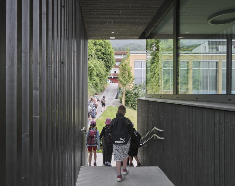 Die neu geschaffene, überdachte Außentreppe bietet den direkten Zugang von den Tagesheimklassen zu dem Spielhof auf kurzem Wege. Die offenen Holzlattenelemente bildet den westlichen Abschluss des Gebäudes und rahmt den Zubau mit seiner hinterlüfteten, vertikalen heimischen Holzfassade zu einer gestalterischen Einheit.