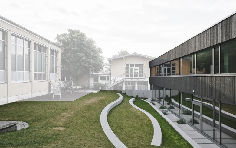 Aufgabe war es, für den kurzfristigen Bedarf Räumlichkeiten für den Mittagstisch mit Speisesaal und Regenerationsküche sowie drei zusätzliche Tagesheimklassen unterzubringen und dabei die Barrierefreiheit und das derzeitige knappe Freiflächenangebot zu verbessern.