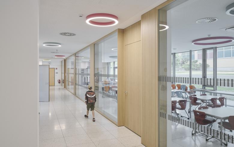 Für den Bodenbelag des Speisesaals sowie der Gangflächen wurde in Anlehnung an den Bestand ein heller Terrazzo gewählt. Die Bodenbeläge der Klassen sowie die Trennwände und Türen von den Erschließungsgängen zu den neu errichteten Räumen wurden in Eiche ausgeführt und geben den Räumlichkeiten zusammen mit den runden Leuchten in verschiedenen Farben einen warmen Charakter und ihre Identität. Auch das Speiseausgabemöbel wurde farblich hervorgehoben.