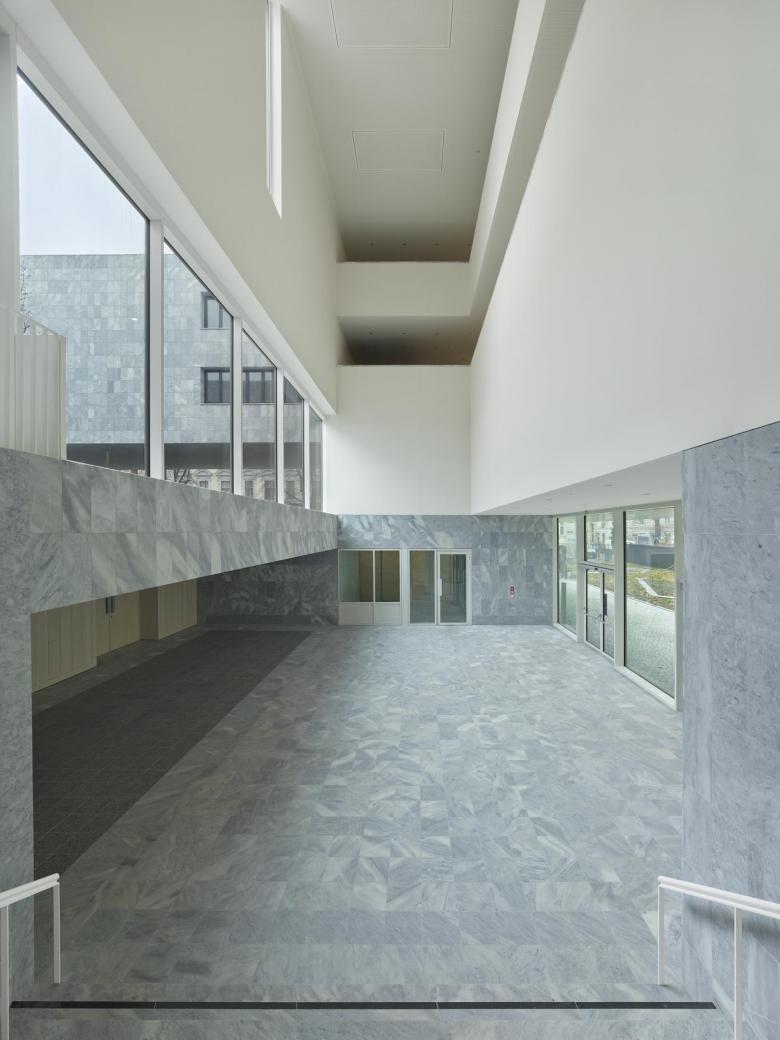 Die Baukörper sind vollständig mit Krastaler Marmor verkleidet, einem Naturstein aus dem Gastgeberland Österreich. Seine helle, lebendige Oberfläche verändert je nach Lichteinfall ihre Anmutung und verstärkt so die Plastizität der architektonischen Komposition. In den Bodenbelag der Residenzterrasse, ebenfalls aus Krastaler Marmor gefertigt, sind Bodenreliefs integriert, die als Kunst am Bau von Blasius Spreng für den Vorgängerbau von Rolf Gutbrod geschaffen wurden. Ein besonders intensives Zusammenspiel von Kunst und Architektur zeigt sich im neu geschaffenen Kunstwerk „Deform“ von Stefan Sous. Dabei handelt es sich um eine kreissegmentartige Verformung des die Botschaft umgebenden Zauns – ein künstlerischer Eingriff, der symbolisch einen Teil des Botschaftsgrundstücks an die Wiener Öffentlichkeit zurückführt.