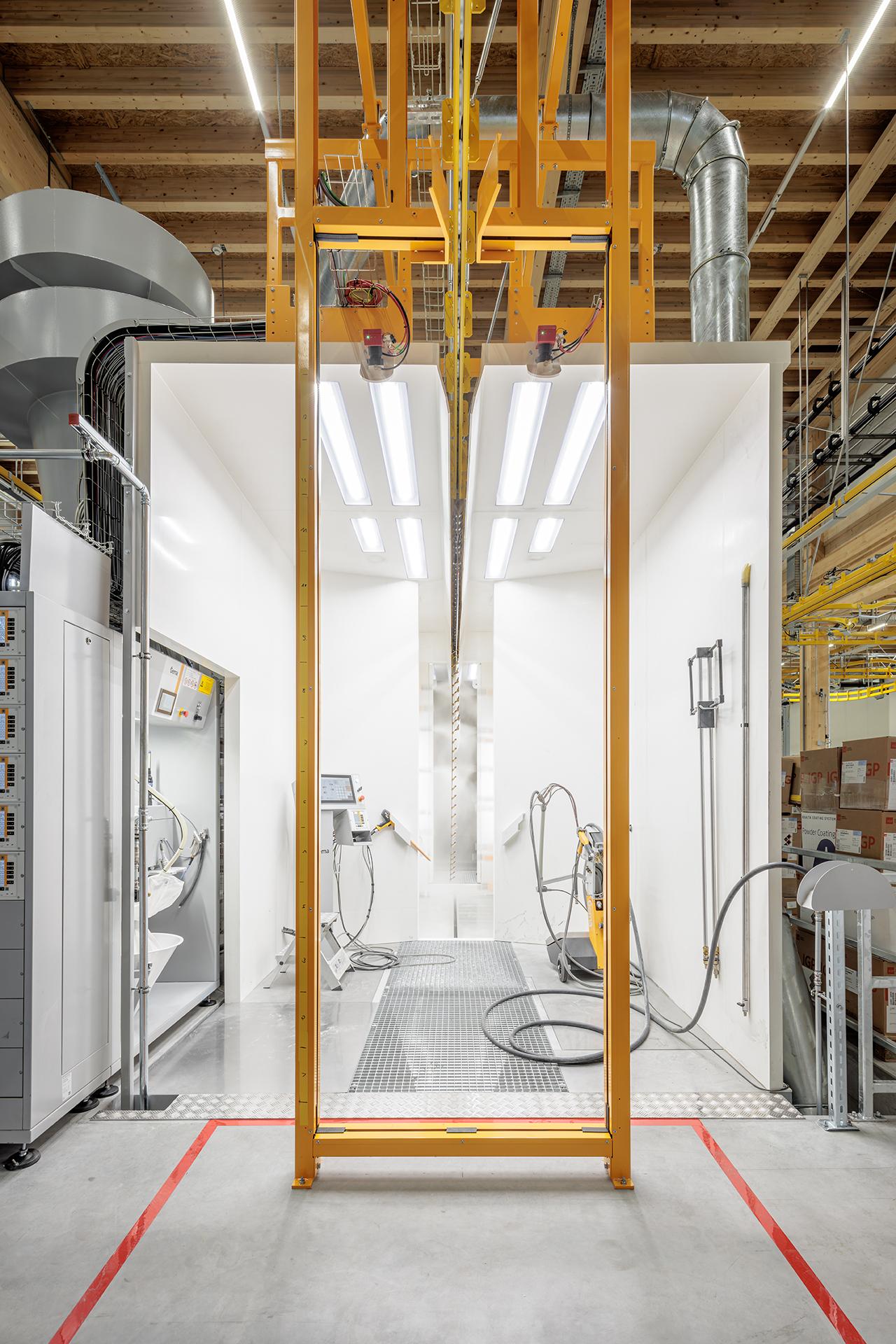 Eine Werkhalle ganz aus Holz zu bauen, mag zunächst überraschen. Bisher war Stahl im Industriebau der Baustoff der Wahl. Griesser selbst verfügt gleich neben dem nun vergrößerten Firmengebäude über eine Produktionshalle in Stahlbauweise. Doch Holz bietet eine ganze Reihe an Vorzügen: Zunächst verkürzt der Naturbaustoff die Bauzeit. Vorarlberger Baufirmen brauchten nicht einmal ein Jahr, um die Halle aus einheimischem Holz fertigzustellen und auszustatten. So konnte Griesser die Produktion zügig aufnehmen – ein großer wirtschaftlicher Pluspunkt. Auch für die Montage der Pulverbeschichtungsanlage, in der Fensterläden aus Aluminium veredelt werden, bedeutete die Holzkonstruktion einen Vorteil: »Für unseren Schweizer Lieferanten war es eine Premiere: Zum ersten Mal installierte er eine seiner Anlagen in einen Holzbau«, erklärt Griesser-Austria-Geschäftsführer Martin Barwart. »Das komplette Aufhängesystem sowie die Anlagen wurden direkt an die Träger geschraubt. Hilfreich waren die im Vergleich zum Stahlbau größeren Toleranzen: Wir konnten während des Einbaus ohne weiteres kleine Anpassungen vornehmen.« Und auch wer befürchtet, der Brandschutz werde in einer Holzhalle zum Problem, irrt. »Ich engagiere mich bei der Feuerwehr«, erklärt Martin Barwart. »Aus Erfahrung weiß ich, dass Brände in Stahlbauten viel gefährlicher sind. Denn während Stahlkonstruktionen plötzlich versagen und aufwendig mit Lackierungen geschützt werden müssen, können massive Holzbauteile den Flammen lange standhalten.«