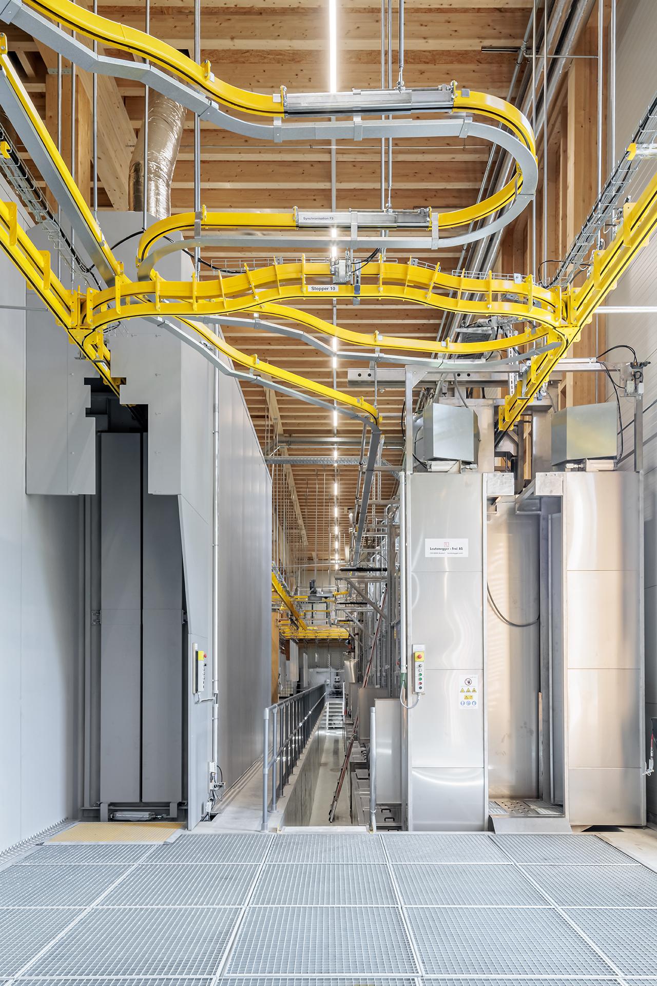 Eine weitere Energiequelle ist die Beschichtungsanlage selbst: Sie erzeugt viel Abwärme. Nutzbar wird diese durch ein System mit Wärmepumpe und Absauganlage. Über dieses kann die Halle geheizt und gekühlt werden. Außerdem wird die Vorbehandlung, bei der die Bauteile auf die Beschichtung vorbereitet werden, über die Wärmepumpe beheizt – was eine Energieersparnis von nicht weniger als 25 Prozent bedeutet. Um noch mehr Energie zu sparen, wurde auch der Beschichtungsvorgang selbst weiterentwickelt: Neu liegt die Einbrenntemperatur niedriger als üblich, was den Energieaufwand um weitere 10 Prozent senkt. Sogar das Abwasser wird als Ressource genutzt: Die Werkhalle verfügt über eine eigene Aufbereitungsanlage. Einen Anschluss ans Abwassernetz gibt es nicht.