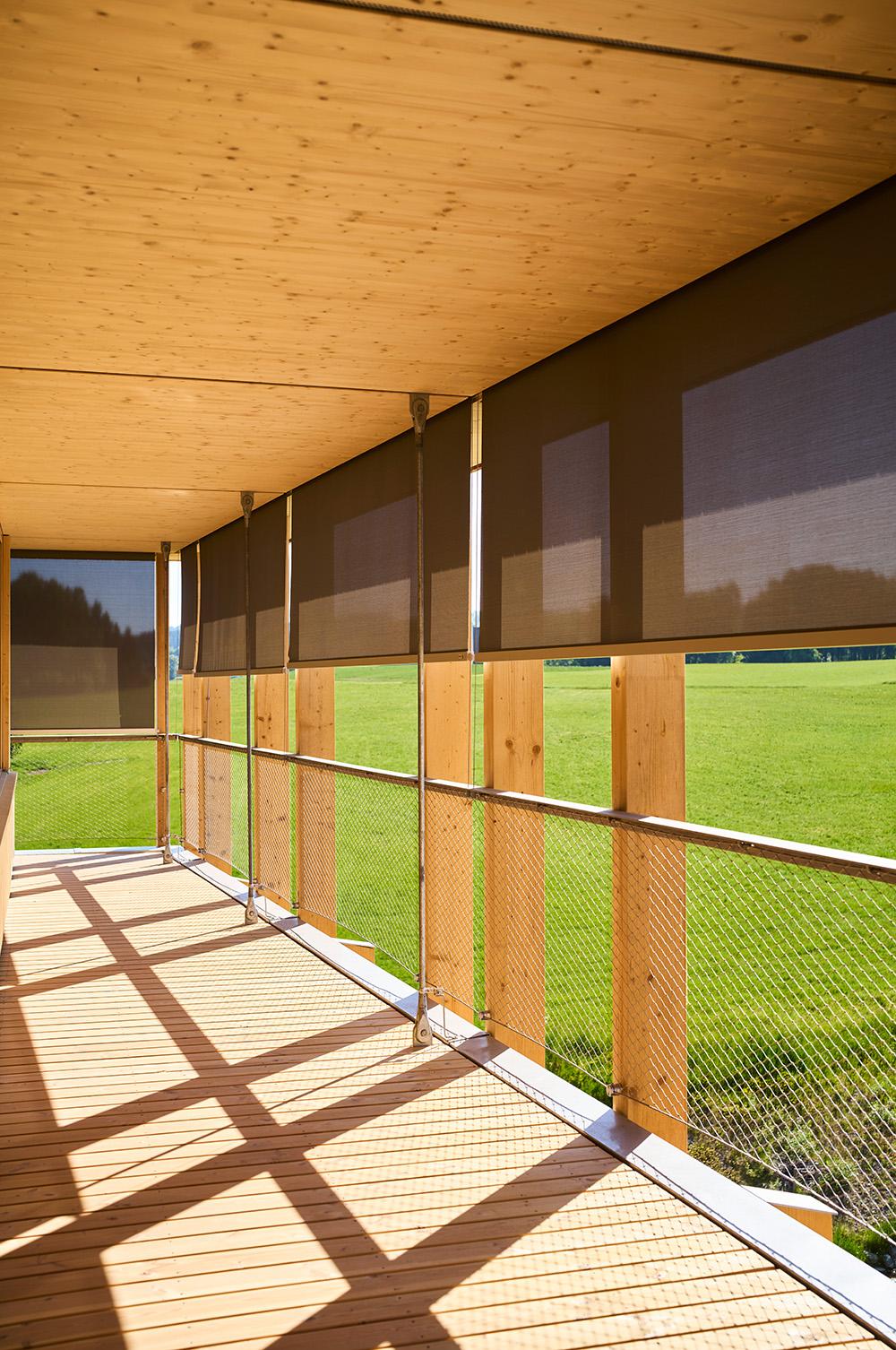 Johanna Deinet: Eine Herausforderung beim Blumer Lehmann-Bau waren die Sonnenschutzrollos. Wir wollten sie ganz außen an der Fassade montieren, um eine gute Durchströmung zu erreichen und eine Klimapufferzone auszubilden. Außerdem können dank des Abstands zur Gebäudehülle die Brüstungsbereiche frei bleiben, sodass selbst bei geschlossenen Storen ein Blickfenster zur Landschaft offen bleibt. Zugleich sollten die Rollos ästhetisch und leicht transparent sein. Also entschieden wir uns für filigrane, seilgeführte Textilstoren von Griesser, die bei Sonne automatisch herunterfahren. Doch eigentlich dürfen diese nicht so hoch und exponiert am Gebäude eingebaut werden: Der Wind könnte sie beschädigen. Mit der Bauherrschaft haben wir entschieden, diese Sicherheitsvorgabe zu ignorieren. Falls tatsächlich einmal an einem heißen Tag starker Wind bläst, öffnen sich eben einige Storen und es wird im Gebäude etwas wärmer.