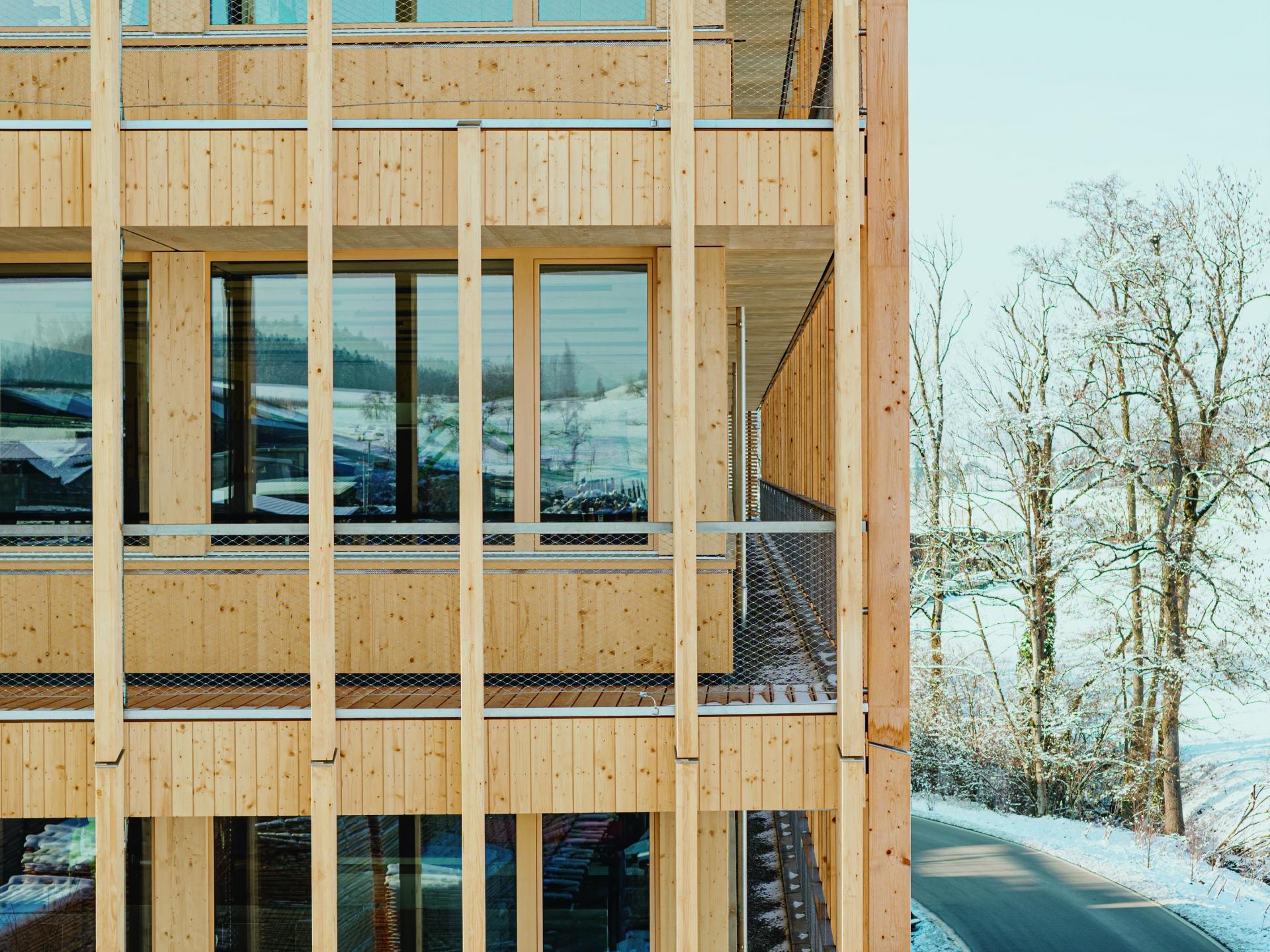 Johanna Deinet: Wir hatten das Privileg, für Blumer Lehmann zu bauen. Bei dieser Firma ist das Umweltbewusstsein sehr ausgeprägt und die Experimentierfreudigkeit groß. Beim neuen Hauptsitz auf dem Erlenhof bei Gossau sollten alle Möglichkeiten des modernen Holzbaus ausgereizt werden. Inspiriert auch von eurer Landwirtschaftsschule, Andy, haben wir die Fassade mit umlaufenden Balkonen zur Beschattung versehen und ein System der Nachtauskühlung mit automatischen Lüftungsflügeln eingebaut. Für zusätzliche Abkühlung sorgen Kühlschlangen, die dem Erdreich Kälte entziehen und in die Büros leiten.