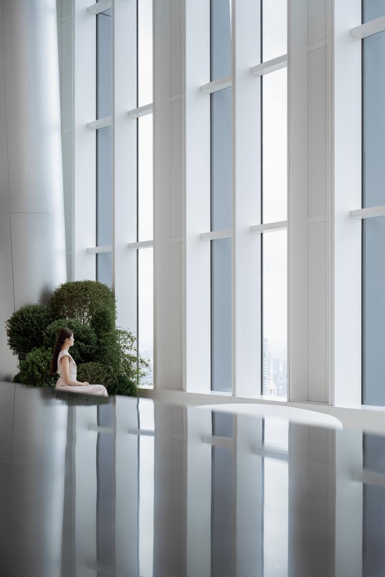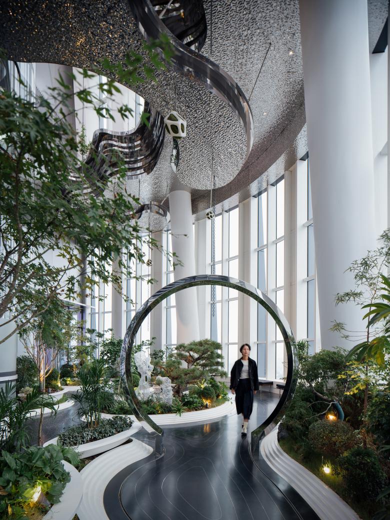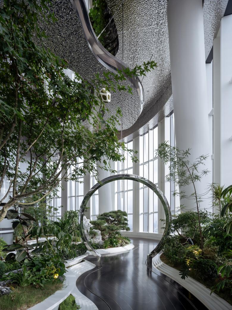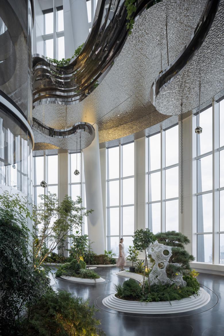 On the 55th floor, a 120-sqm outdoor space, 25 meters high. Inspired by the idea of duality, we paired the “iceberg” with a “green heart”—a green garden. Duality also put me off recreating a classical Chinese garden like the one we planned for Shanghai Center. Instead, we deconstructed one, drawing inspiration from Yu Garden, and reassembled it as a suspended garden in a vertical way. Across the 25-meter height, the architects and landscape designers customized rippled stainless steel of different heights to wrap the floating island garden. The journey from the 55th floor to the 57th floor by the sightseeing elevator is traversing a vertical garden. Each layer of the floating garden casts a shadow on the 120 sqm floor of the 55th floor, which simulate water with black terrazzo and metal ripples. The floating garden creates more than 100% green coverage. A stainless steel moon gate and 3D-printed Taihu rocks, paying attribute to the Yu Linglong in Yu Garden, visually pair the historical and the contemporary in this reconstructed Chinese garden.