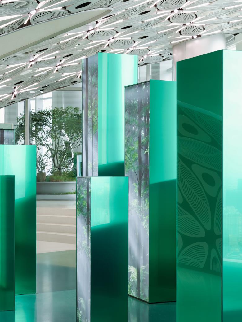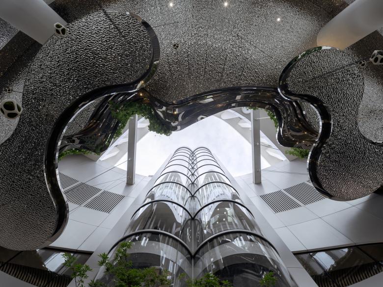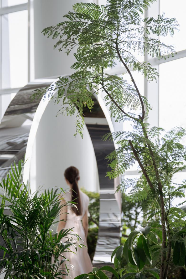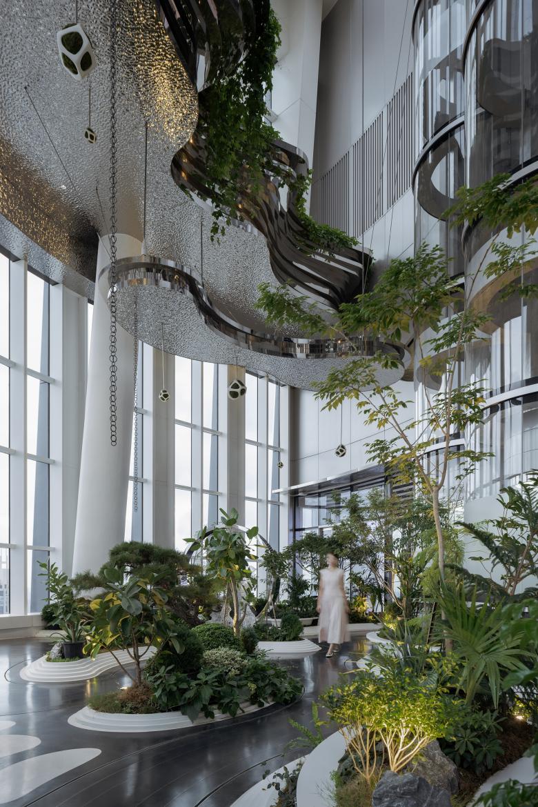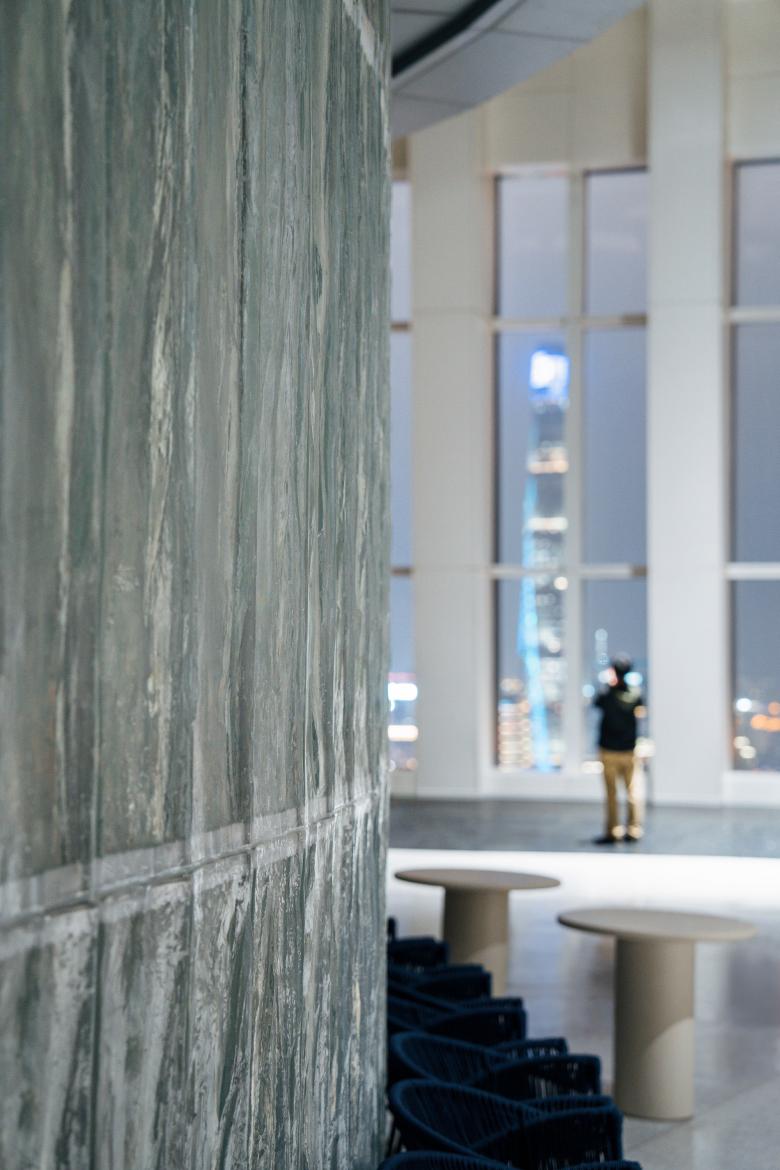 On the 55th floor, a 120-sqm outdoor space, 25 meters high. Inspired by the idea of duality, we paired the “iceberg” with a “green heart”—a green garden. Duality also put me off recreating a classical Chinese garden like the one we planned for Shanghai Center. Instead, we deconstructed one, drawing inspiration from Yu Garden, and reassembled it as a suspended garden in a vertical way. Across the 25-meter height, the architects and landscape designers customized rippled stainless steel of different heights to wrap the floating island garden. The journey from the 55th floor to the 57th floor by the sightseeing elevator is traversing a vertical garden. Each layer of the floating garden casts a shadow on the 120 sqm floor of the 55th floor, which simulate water with black terrazzo and metal ripples. The floating garden creates more than 100% green coverage. A stainless steel moon gate and 3D-printed Taihu rocks, paying attribute to the Yu Linglong in Yu Garden, visually pair the historical and the contemporary in this reconstructed Chinese garden.