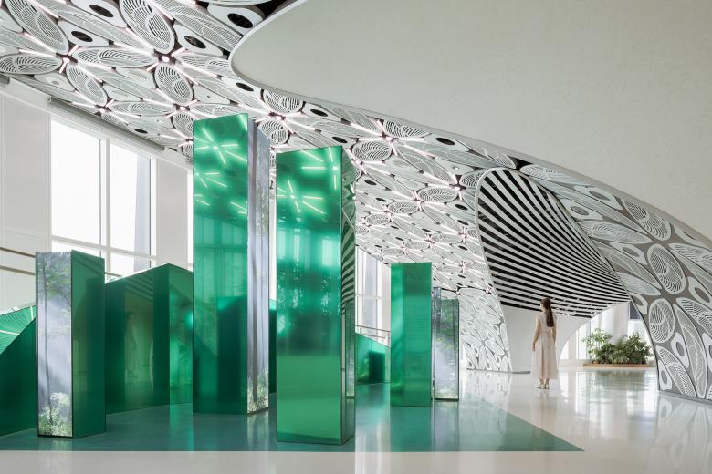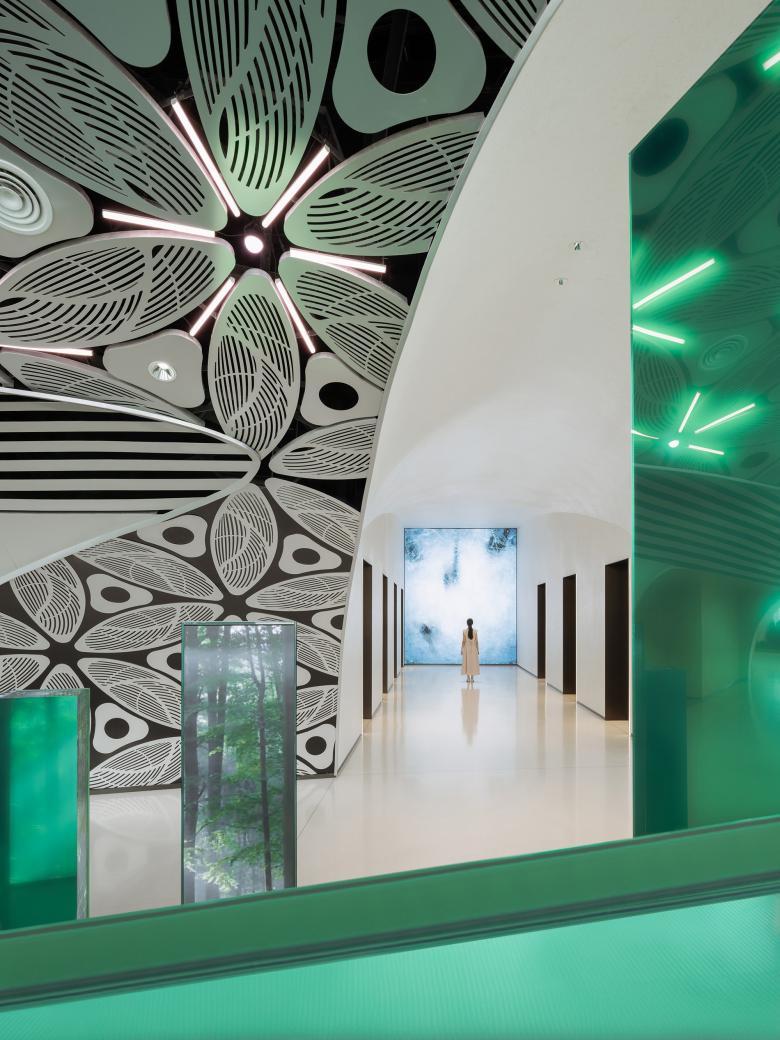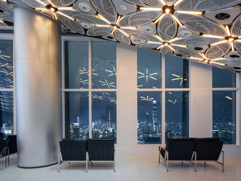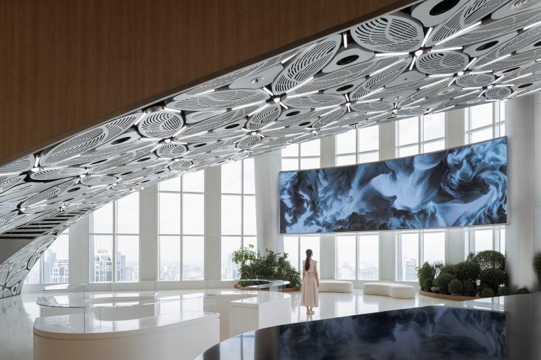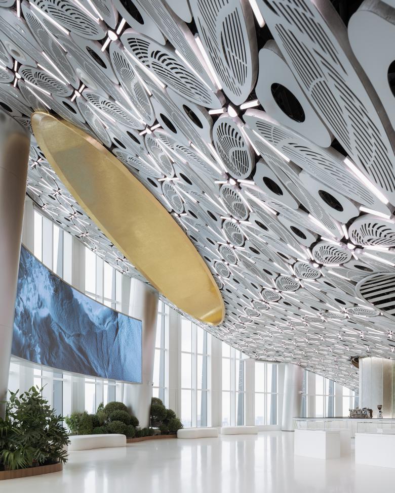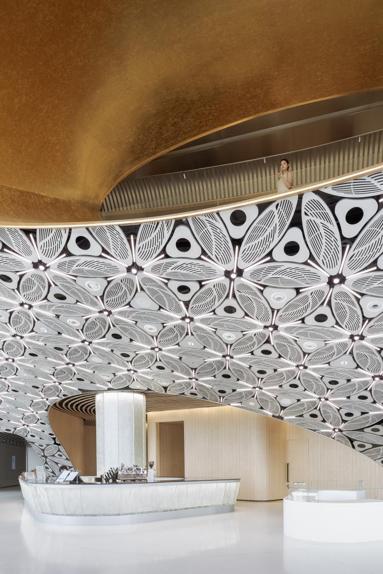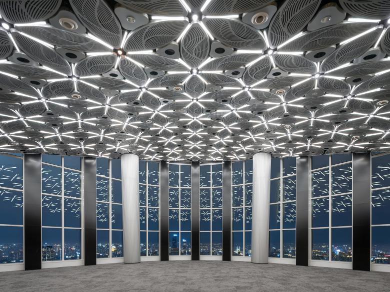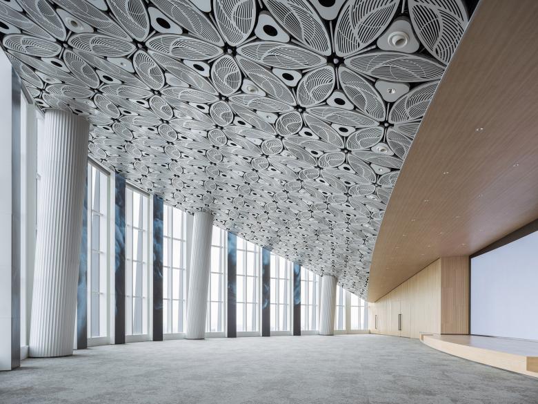 The 55th floor houses a double-height observation café and a convention hall. Repeating the white arched vaults like the 56th floor would be monotonous. Furthermore, the more complex array of equipment—speakers, broadcast systems, cameras, fire sprinklers, smoke detectors, light fixtures, and air vents—would disrupt the purity of the continuous vaults. Suddenly, a bold idea struck me: why not turn all of it into a pattern, using computational technology to integrate these various openings and devices? Inspired by the link between ice and snow, we developed a six-petal snowflake motif, translated into 1,100 grass leaf shaped perforated anodized aluminum panels. Together, they form a continuous, expansive ceiling pattern that incorporates all technical elements.
