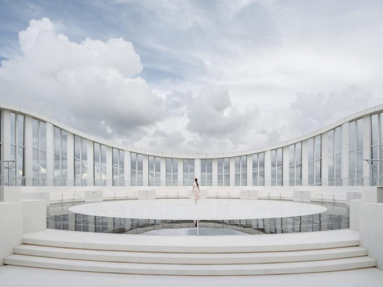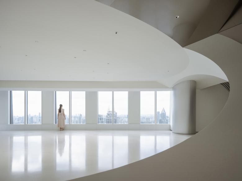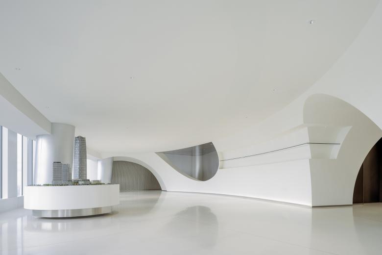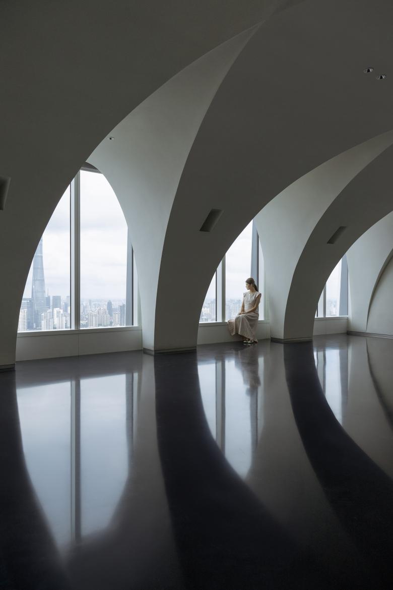 Once the tower crown's interior becomes an iceberg and caves, the space severs its relationship with the exterior façade. The greater the contrast between the interior and the glass curtain wall that tourists are so familiar that they often overlook, the stronger the dramatic tension created, and the greater the emotional value provided to visitors. Emotional value is also a function. Using continuous white arches, the architect shaped the 56th floor, mainly constitute of small-scale spaces—small exhibition areas, meeting rooms, and lounge —as a space with continuous iceberg caves. This achieved the first step in creating iceberg in the tower crown . In this case, we can say that form is function.