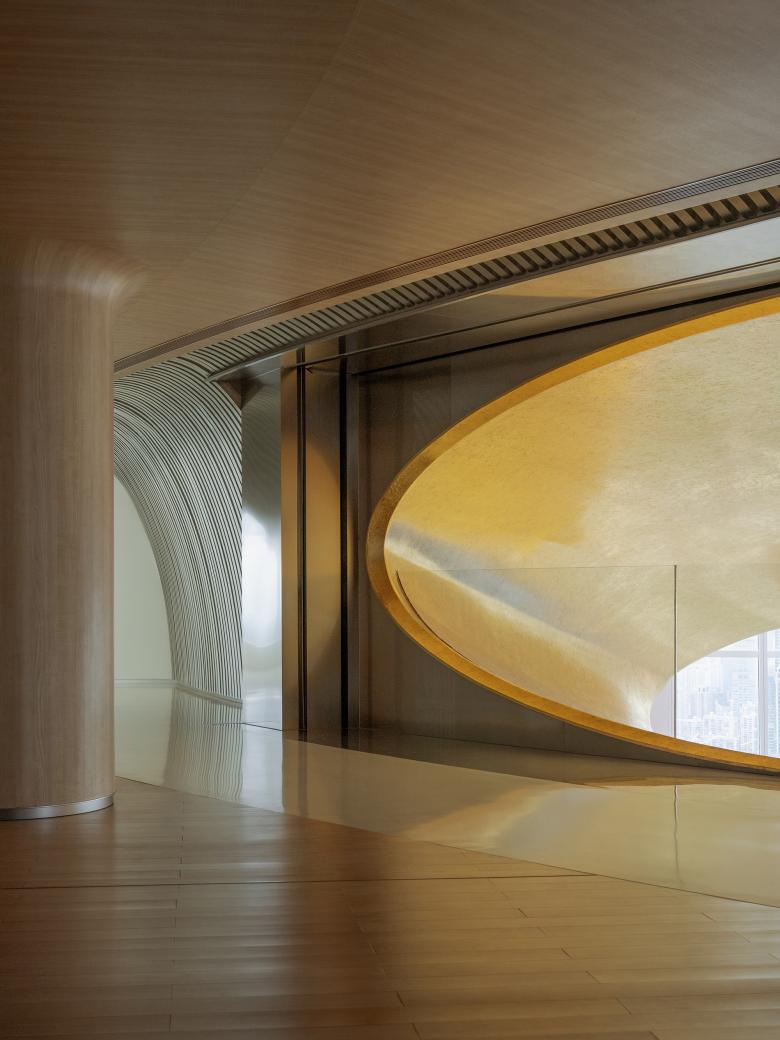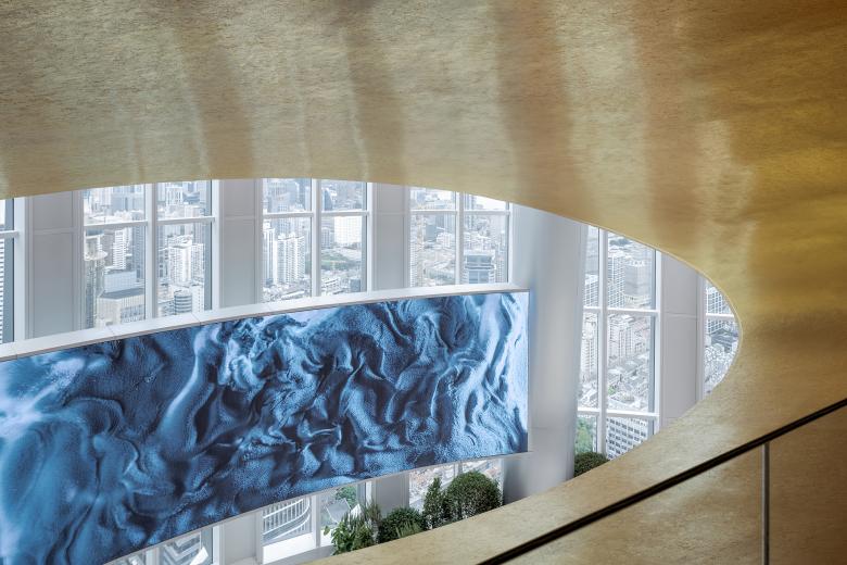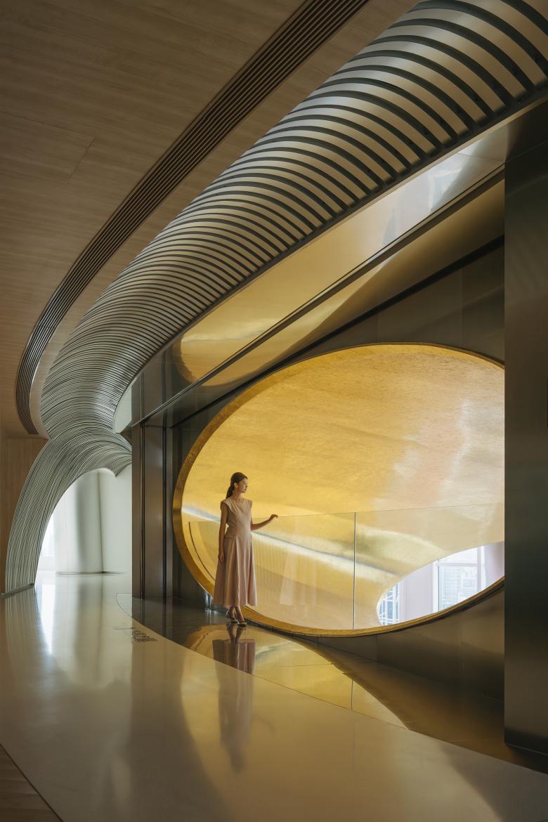 Between the 55th floor and 56th floor, the architect created two large 'eyes' framed by arched openings to connect the spaces. The 'Golden Eye' on 56th floor looks over the circular large screen of the café observation on the 55th floor towards the thriving city of Shanghai. The other eye looks through the suspended garden towards Xintiandi's Taiping Lake and the Site of the First National CPC. Shanghai is a miracle that grew rapidly within far-sighted vision. This pair of discerning eyes is an extra chapter of building the iceberg.