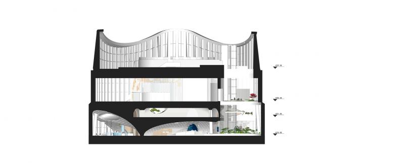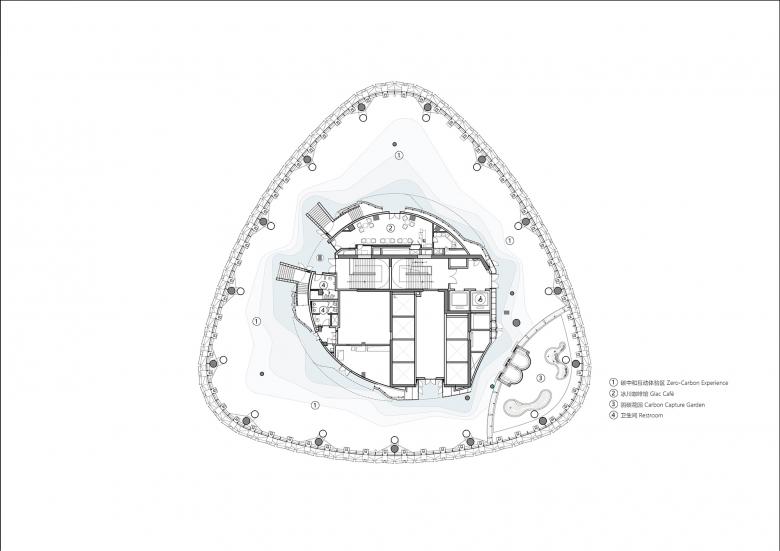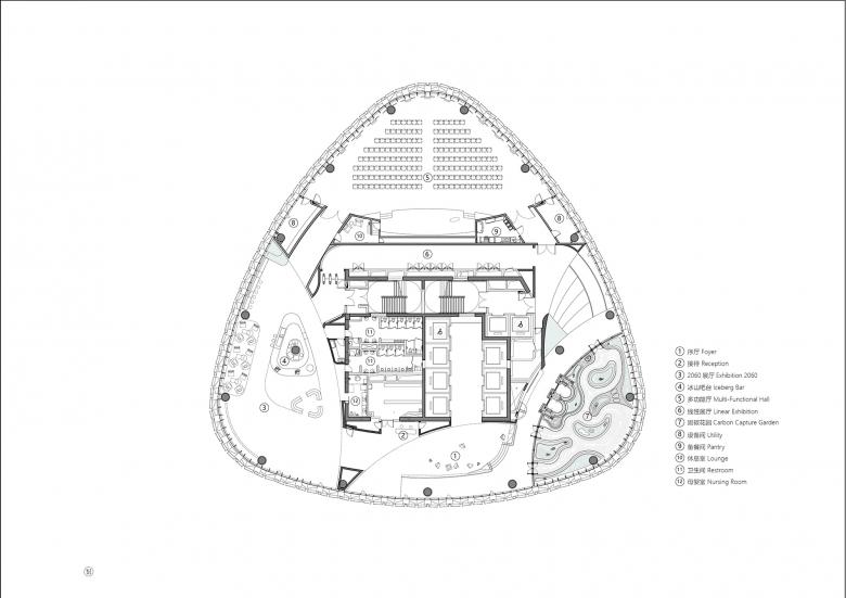 I decided to design the entire site—the 55th floor, 56th floor, 57th floor the rooftop and the 58th floor—as an iceberg in an abstract form. The 57th floor, the main outdoor observation deck, represents the sea surface with floating ice. The mechanical rooms above the 57th floor up to the helicopter rescue platform on the 58th floor stands for the iceberg visible above the sea. The indoor spaces of the 55th floor and 56th floor—including the entrance lobby, observation decks, exhibition halls, café, convention hall, floating garden, meeting rooms, and lounge—constitute the submerged part of the iceberg. The functional spaces are designed as caves within the iceberg, consistently using a refined vocabulary of arched elements to create a familiar strangeness that is perceptible. With slight explanation, visitors can reach a consensus of sudden understanding. This familiar yet the form of which has not been commonly defined type of place—the observatory—thus becomes perceptible and comprehensible.