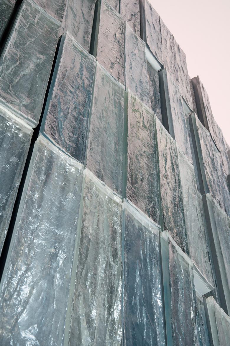 On the white terrazzo 'sea surface' of the 57th floor, the rooftop, we collaborated with Mr. Shi Jun, a Shanghai Master of Arts and Crafts to transform elevator equipment rooms into abstract ice forms using translucent glaze—a material that echoes real ice, directly referencing the iceberg theme. Behind these glacial walls, LED lighting by OPPLE offers two modes: one shifts colors, turning the iceberg into a colourful mountain; the other evokes a subtle scene of the Yangtze River. The iceberg uses the material of glaze, emotionally connecting itself to Shanghai. This was the third step building the iceberg.