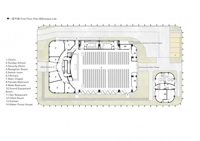 The brief called for the main and ancillary buildings to be separated. I decided to use the 16.7m high main hall as the core of the main building, inserting offices and other facilities on its west and north sides while placing the small auditorium on the highest level of the office area to create a vertical community. And the ancillary building is the canteen. Treating the entire site as a building called a place is my most significant strategy. I have erected a translucent enclosing "veil" as a visual boundary around the architectural control line, while the main and ancillary buildings are buildings within this field defined by this "veil". Together, with the visual boundary of the "veil", they form a complete architectural expression, a complete place.