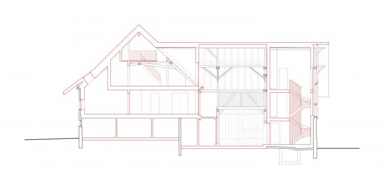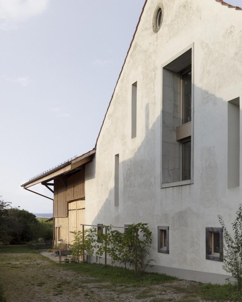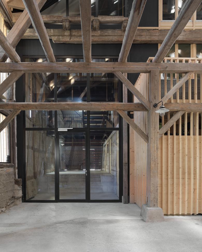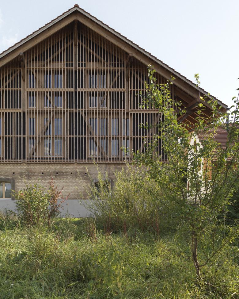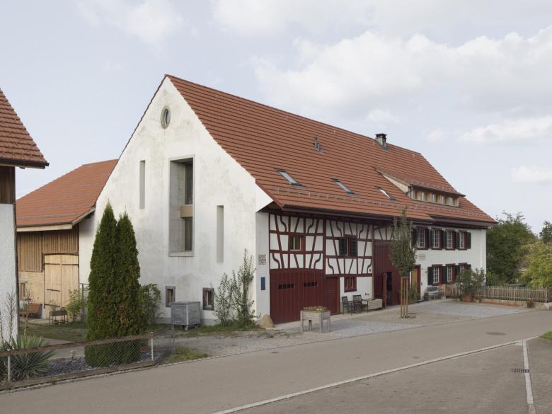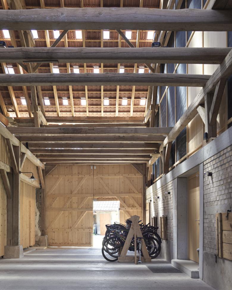 Die neuen Wohnungen im Ökonomieteil und Anbau wurden im Haus-in-Haus-Prinzip innerhalb der bestehenden Volumetrie integriert. Die beiden grosszügigen Tenne im vorderen und hinteren Gebäudeteil dienen als gemeinschaftliche Erschliessung, Begegnungszone und Stauraum.