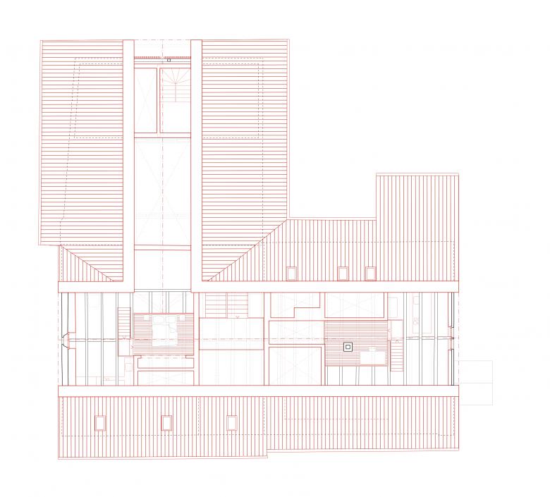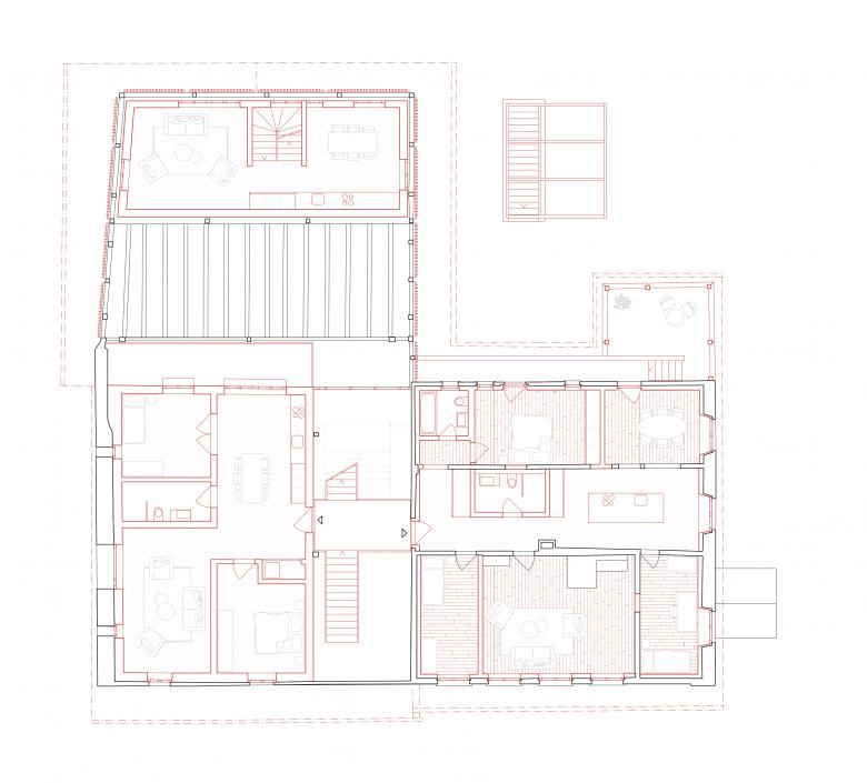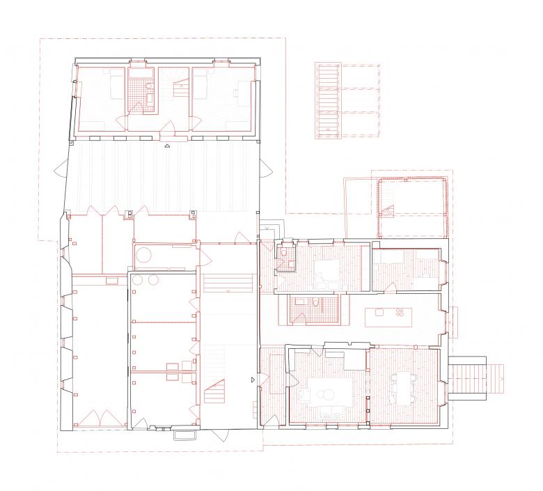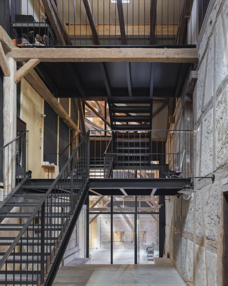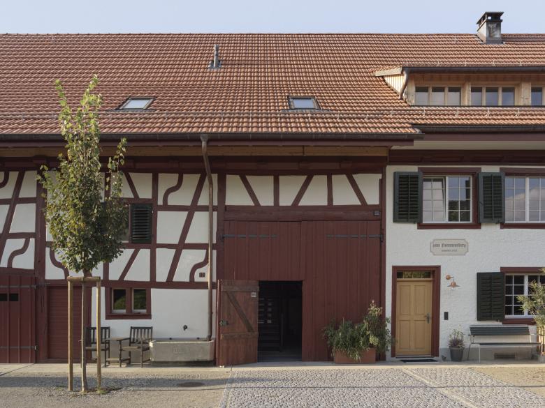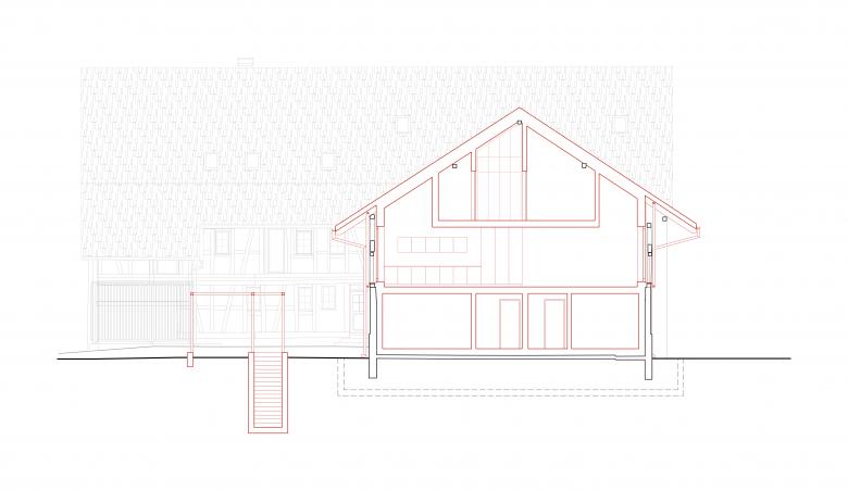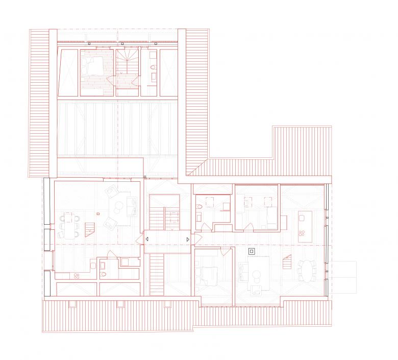 Die neuen Wohnungen im Ökonomieteil und Anbau wurden im Haus-in-Haus-Prinzip innerhalb der bestehenden Volumetrie integriert. Die beiden grosszügigen Tenne im vorderen und hinteren Gebäudeteil dienen als gemeinschaftliche Erschliessung, Begegnungszone und Stauraum.