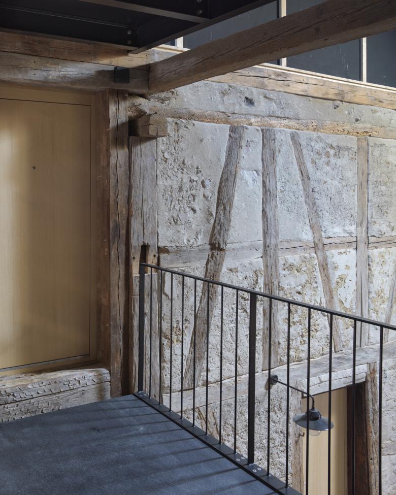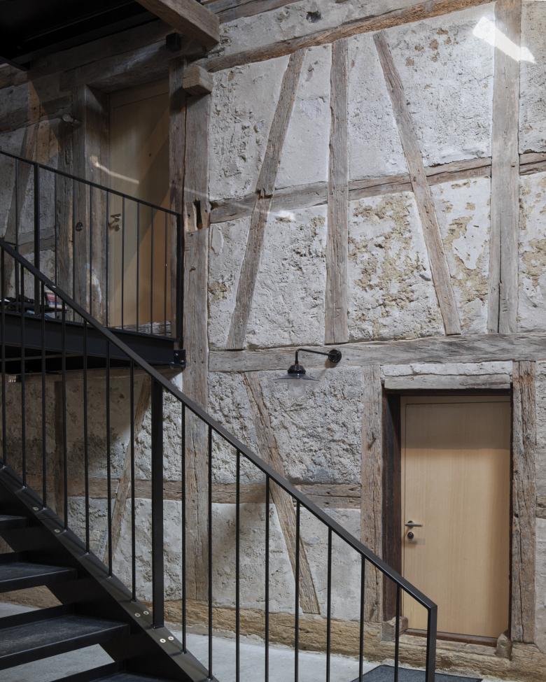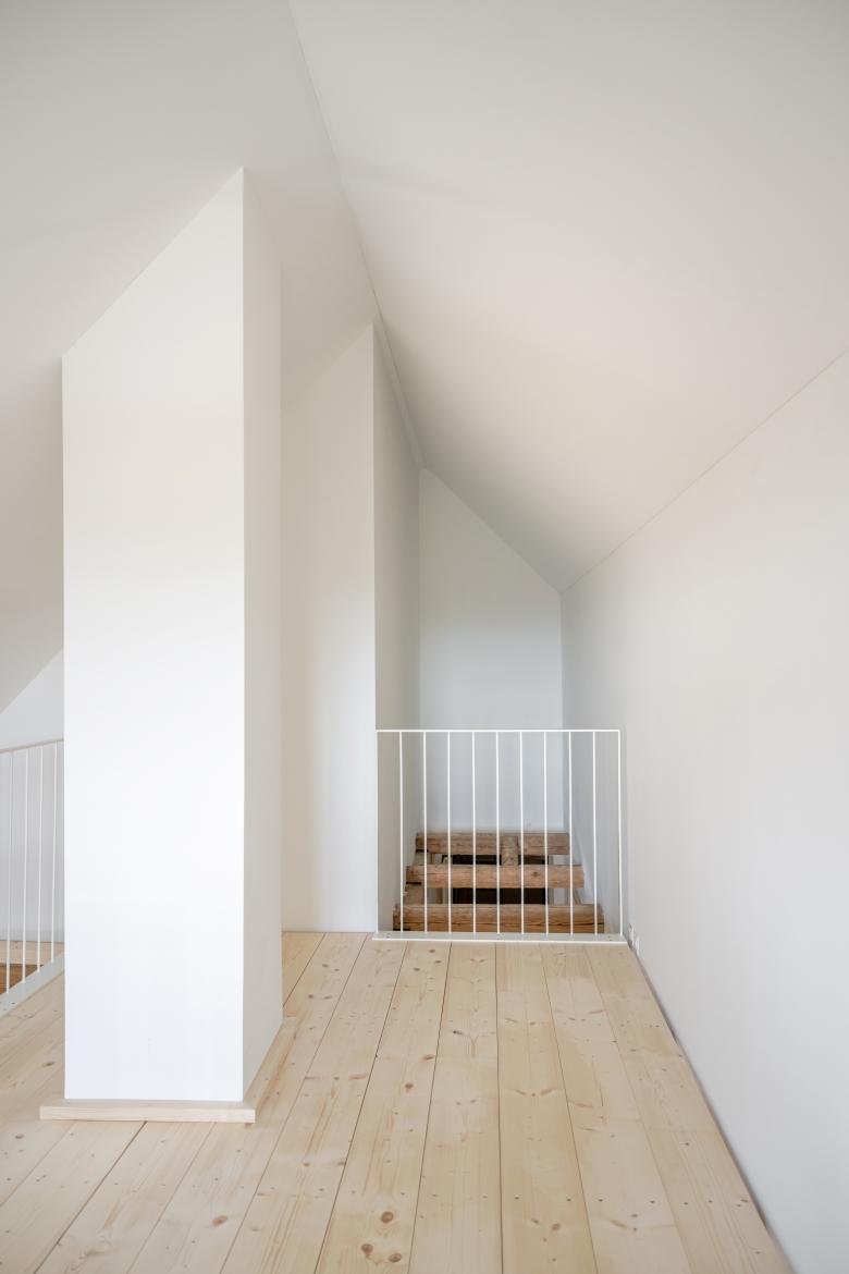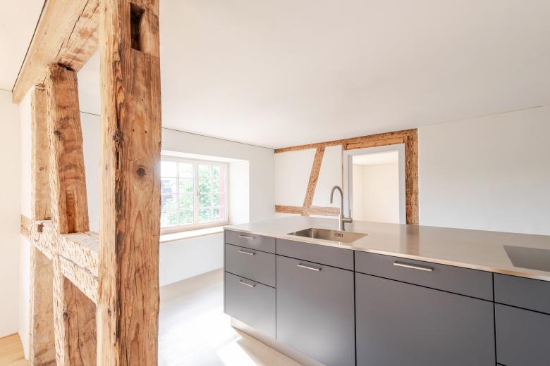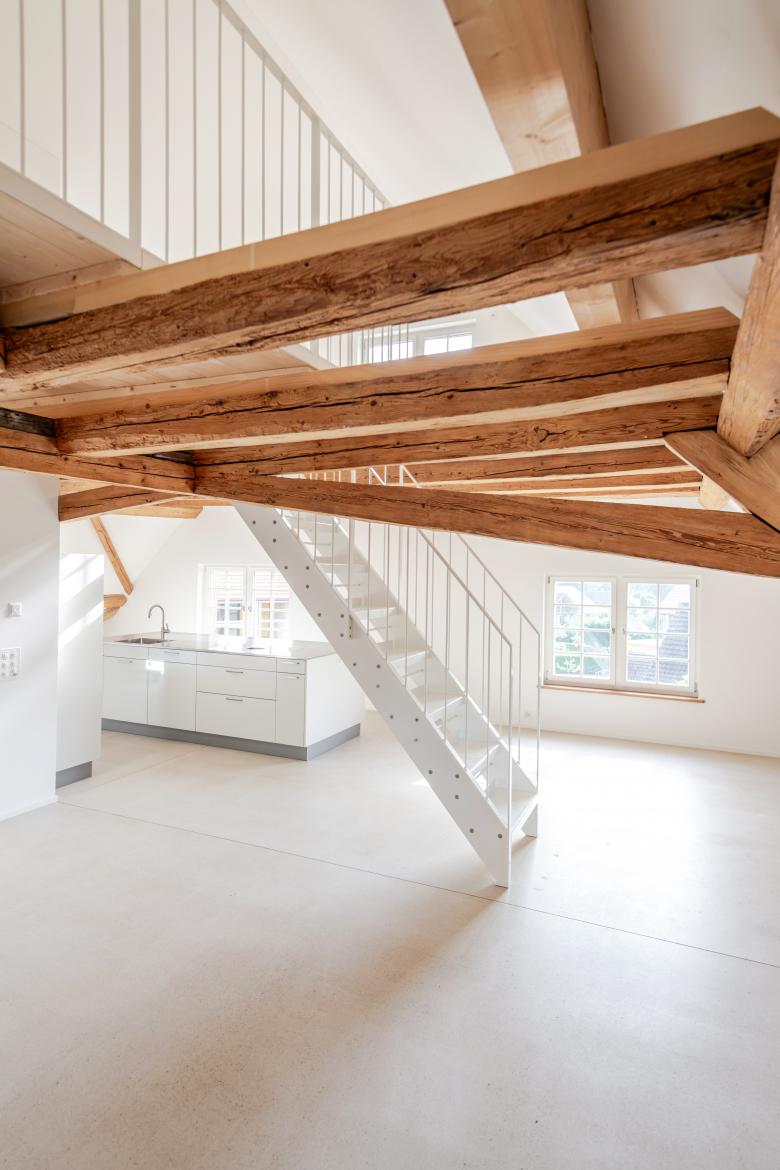 Die Bestandswohnungen wurden unter denkmalpflegerischen Auflagen saniert. Kachelöfen, Täfer und originale Türen blieben erhalten. Helle Materialien, reduzierte Einbauten und eine sorgfältige Lichtführung bringen Grosszügigkeit in die tiefen Grundrisse mit niedrigen Decken. Die neuen Wohnungen zeichnen sich durch individuelle Grundrisslösungen aus – darunter eine kompakte Maisonette über drei Geschosse, Galerien unter dem Dach und ein innenliegender Balkon im rückwärtigen Tenn. Alle Einheiten sind schlicht ausgebaut mit Anhydritböden, Fichtenholz und offenen Raumbezügen.