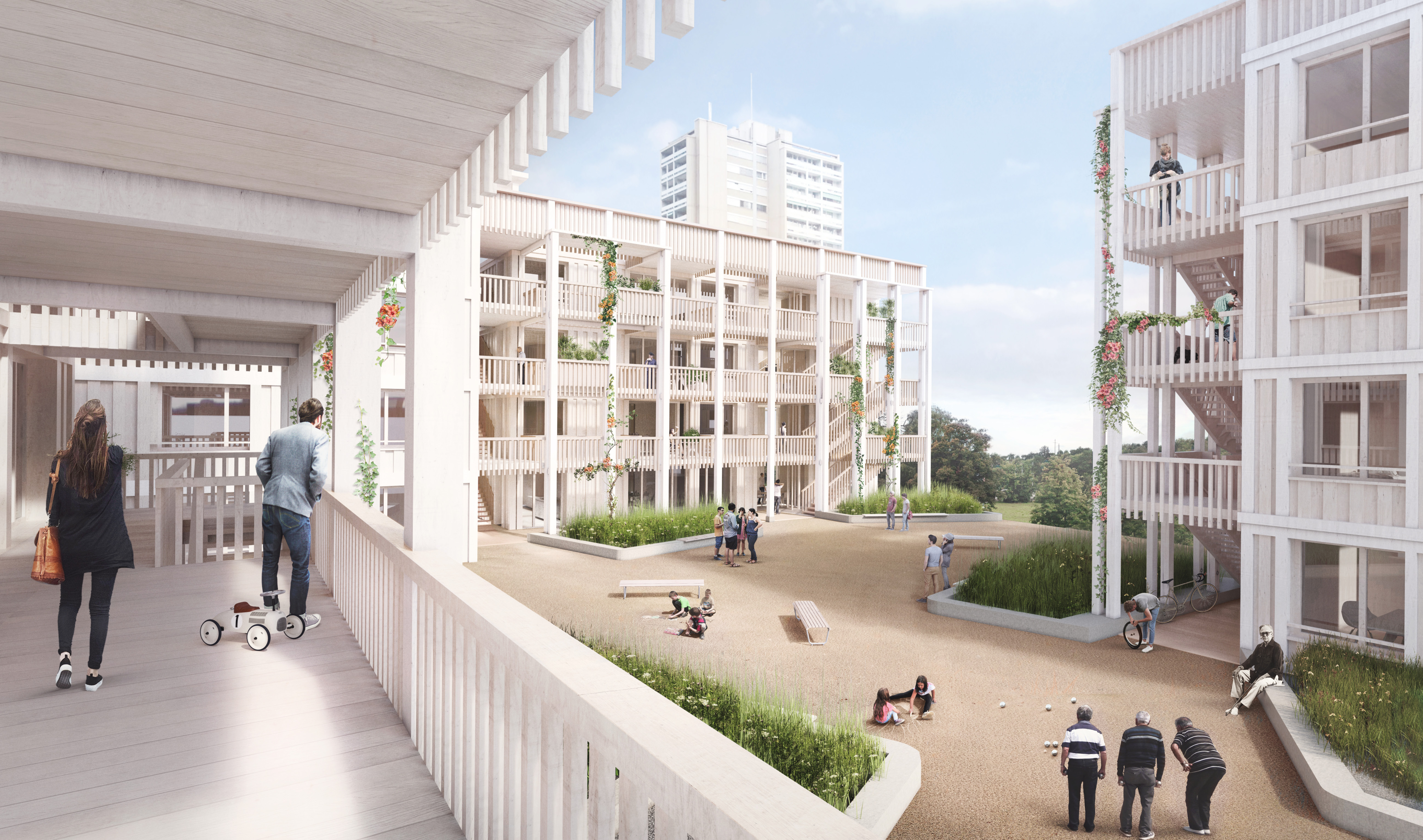 Das Projekt verbindet eigenständige Baukörper mit der nachbarschaftlichen Körnung und hoher Durchgrünung, wobei offene Lauben gemeinschaftliche Räume mit gartenbezogenem Charakter schaffen. Grosszügige Loggien und eine dreiseitige Ausrichtung der Wohnbereiche steigern die Wohnqualität und setzen die Gebäude in spannungsreichen Kontrast zur Umgebung.