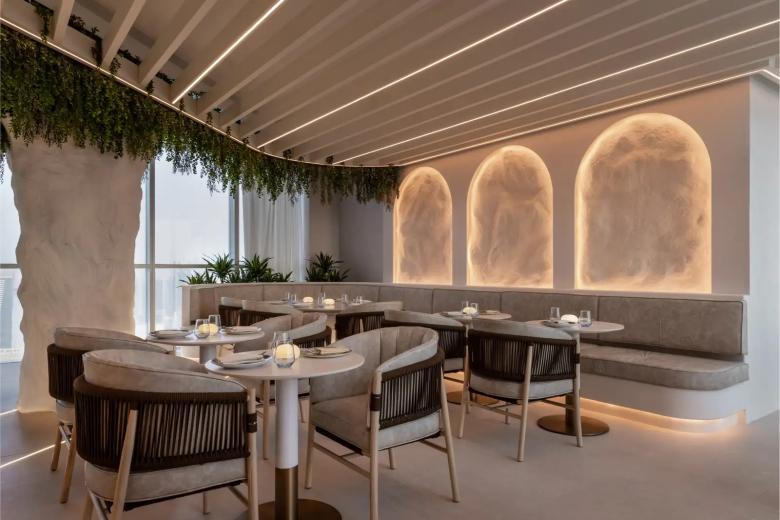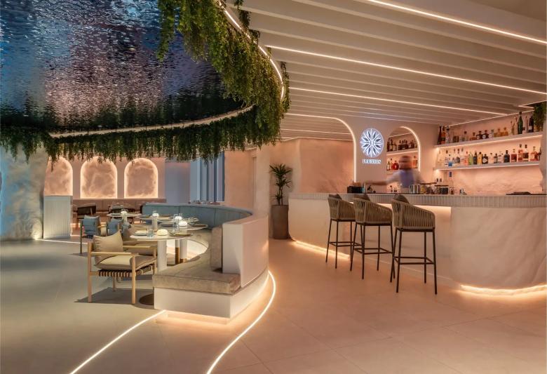 A sweeping curved canopy links the indoor restaurant with the open-air rooftop, creating a continuous architectural rhythm. It blurs the line between interior and exterior, guiding guests through dining, lounging, and poolside experiences. Inside, a rippled blue ceiling evokes the Aegean Sea — shimmering by day and glowing in turquoise hues at night — surrounded by lush greenery that reinforces the idea of an island in the sky.