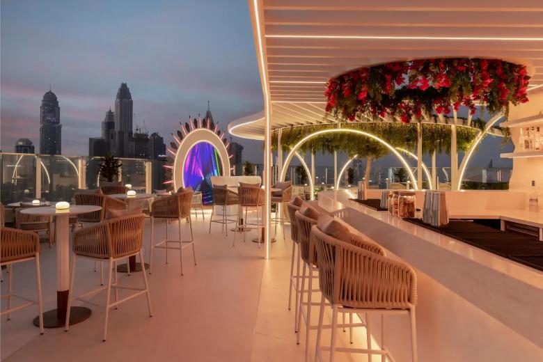 By day, Paros is a breezy, sunlit retreat. White pergolas, pale stone, and woven textures ensure comfort and harmony. Natural ventilation and soft shading define relaxed zones for dining, lounging, and poolside seating — calm, sensorial, and connected to the skyline. At night, integrated lighting transforms Paros into an ambient, energetic venue. The glowing stucco bar, reflective pool, and sculpted DJ booth activate the space while maintaining its architectural calm.