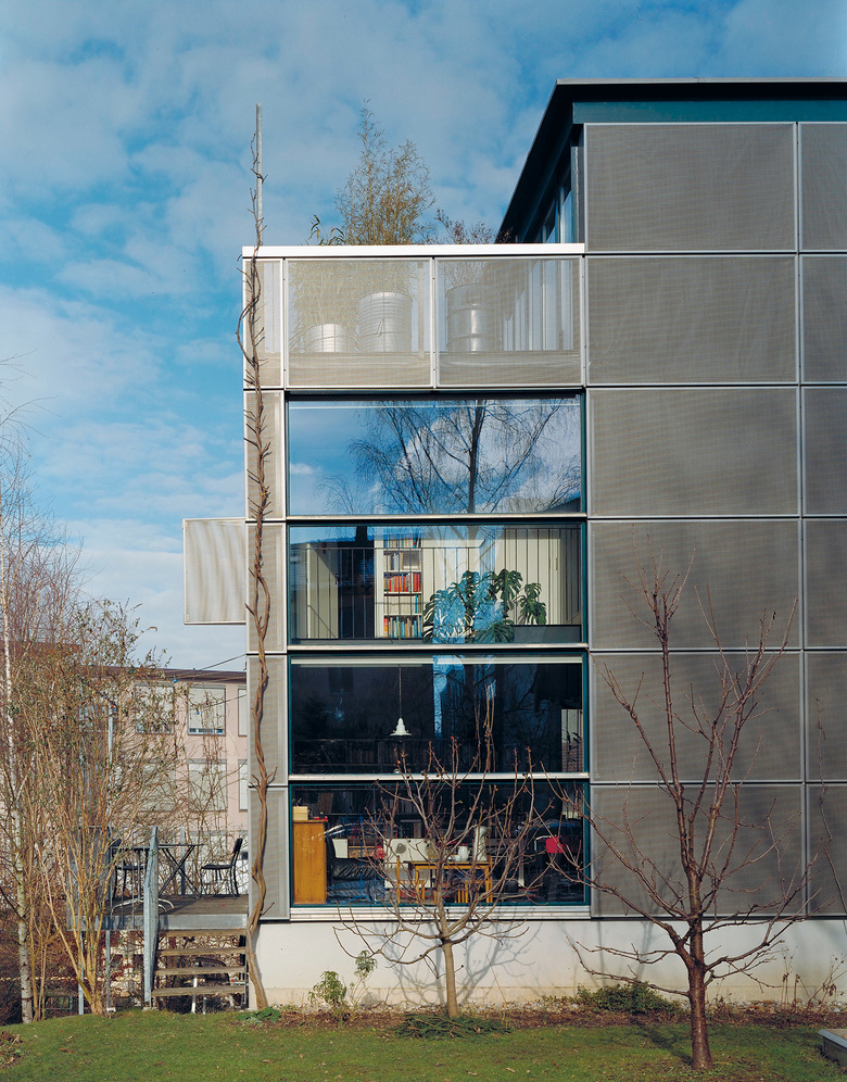 Eine Familie wohnt in einem kleinen Haus auf einer Parzelle und braucht mehr Platz. Geplant ist eine Überbauung mit drei Reihenhäusern, realisiert wird vorerst eine Einheit. Das schmale Haus mit drei Geschossen steht auf einem Betonsockel. Im Erdgeschoss liegt der durchgehende Wohnraum mit Küche und Essbereich. Entlang der künftigen Brandmauer führt die Treppe hinauf in die Schlafräume. Verkleidet ist das Gebäude mit einer Haut aus Schlitzlochblech. Es zieht sich teilweise als Schiebklappläden über die Fenster und wirkt wie ein textiler Vorhang.
