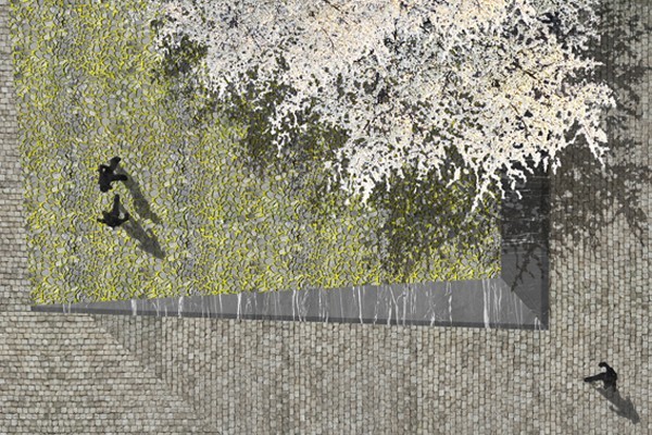 Ausgehend von der bestehenden historischen Pflästerung vor den Hauseingängen wird das „Natursteinpflastergewebe“ weitergestrickt (1). Die 3 Plätze werden in Reihen, mit vorhandenen, halbierten Rundsteinen versehen und durch grosse, geschliffene Blöcke des Schwyzer Alpenkalks gestützt. Wildkirschen spenden Schatten (2). Bewegte Pflastersteinreihen zeichnen die abstrakten Höhenlinien der schiefen Ebene. Sie vermitteln zwischen den Elementen (3).