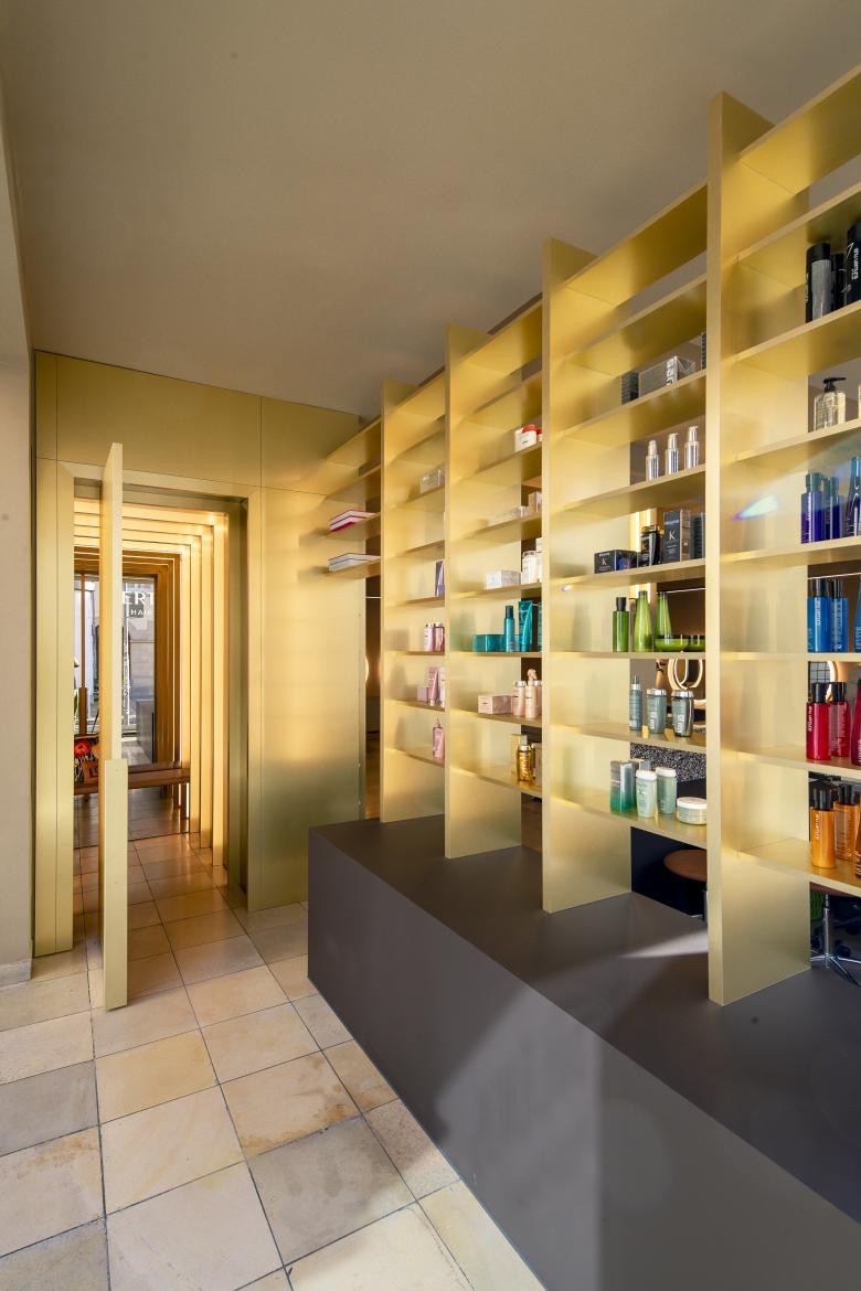 Charakteristisch für die von Cyrus Ghanai neu gestalteten Räume: große Fensterflächen, hohe Räume, ein Boden aus Solnhofer Naturstein und eine feste Möblierung in Form von Friseurstühlen, die der Designer Heinz Legler entworfen hatte. Ghanai öffnete den Eingangsbereich und schuf Platz für eine Theke und ein Verkaufsregal, das nahtlos in einen Schrank übergeht. Hauptthemen des Konzeptes: die Linienführung und das Material der Friseurstühle. Diese adaptierte Cyrus Ghanai auf das Design der Lichtbänder und der Wandbeleuchtung. Passend zur Farbgebung des Bodens ersetzte er die Glasablagen an den Arbeitsplätzen durch Terrazzo, der auch für die Empfangstheke und die Verkleidung der Bar verwendet wurde. Überdies entwarf Ghanai runde und ovale, beleuchtete Spiegel und strukturierte die Waschplätze neu. Für den hinteren Bereich entwarf er eine Bar mit Lounge. Highlight im Konzept: ein Schrank aus Echt-Messing-Laminat. Das verspiegelte und beleuchtete Möbel dient als Ankleide und „Social Media-Fotokabine“. Somit können Pflügers Kunden die neuen Looks direkt auf Social Media präsentieren.