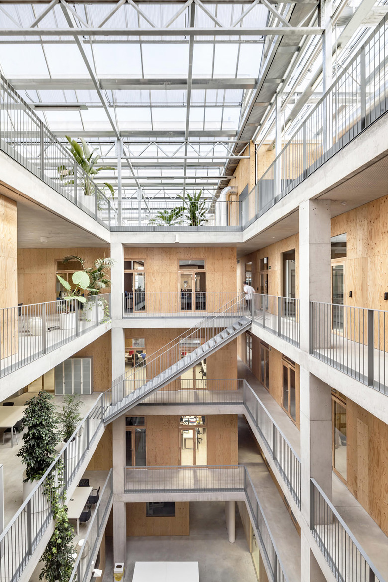 In the middle of the building four patios, with stairs that connect the different levels at certain points, guarantee light and ventilation in all workspaces reducing the consumption of artificial lighting. These patios, as well as the in-between spaces and the perimeter gallery, contain several plant species that allow to improve the comfort through the adjustment of the humidity gradient.