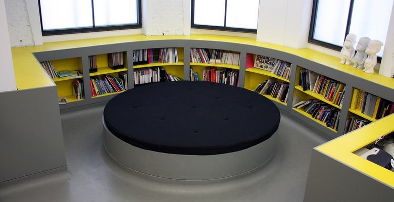 Nexus Productions is an international award-winning animation film company. magma architecture redesigned a former bank building in East London into their central offices. The concept was to emphasize the existing state as on old building with a changing history and to compliment it with new elements: the highly refined “tubs” and “prisms” contrast with the untreated surfaces and exposed piping of the old building. The walls act in a variety of ways. In the entrance area an upstand creates and informal meeting, waiting and reading area. The surrounding tub-walls integrate shelves and serve as a library. Further storage and ducts are integrated into the tub walls. Docked to the “tub” are the three meeting rooms: the “prisms”. With their facetted surfaces they allow a regular spread of light for the presentation of films. These bright, crystalline interiors create a dynamic atmosphere that reflects the work of the client.