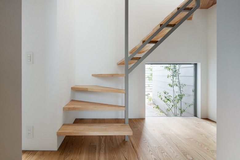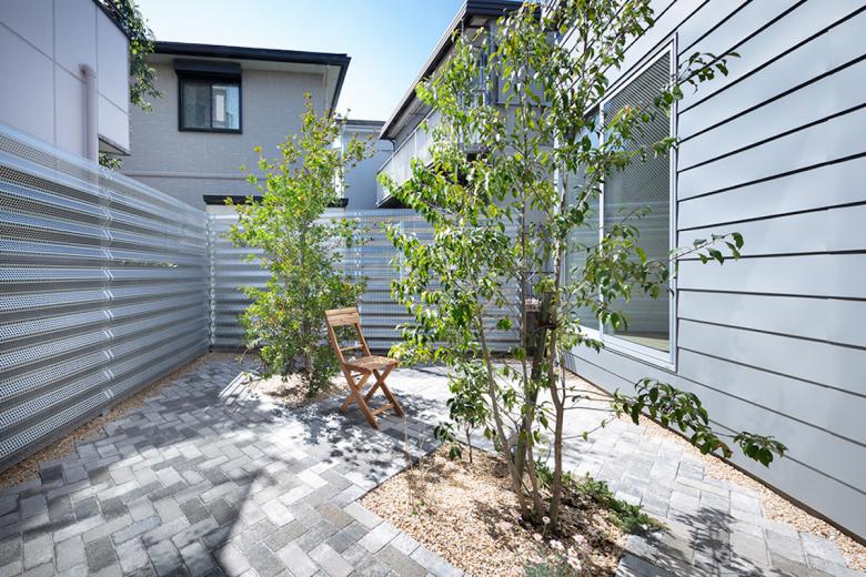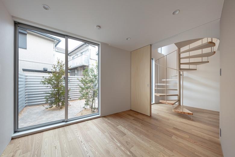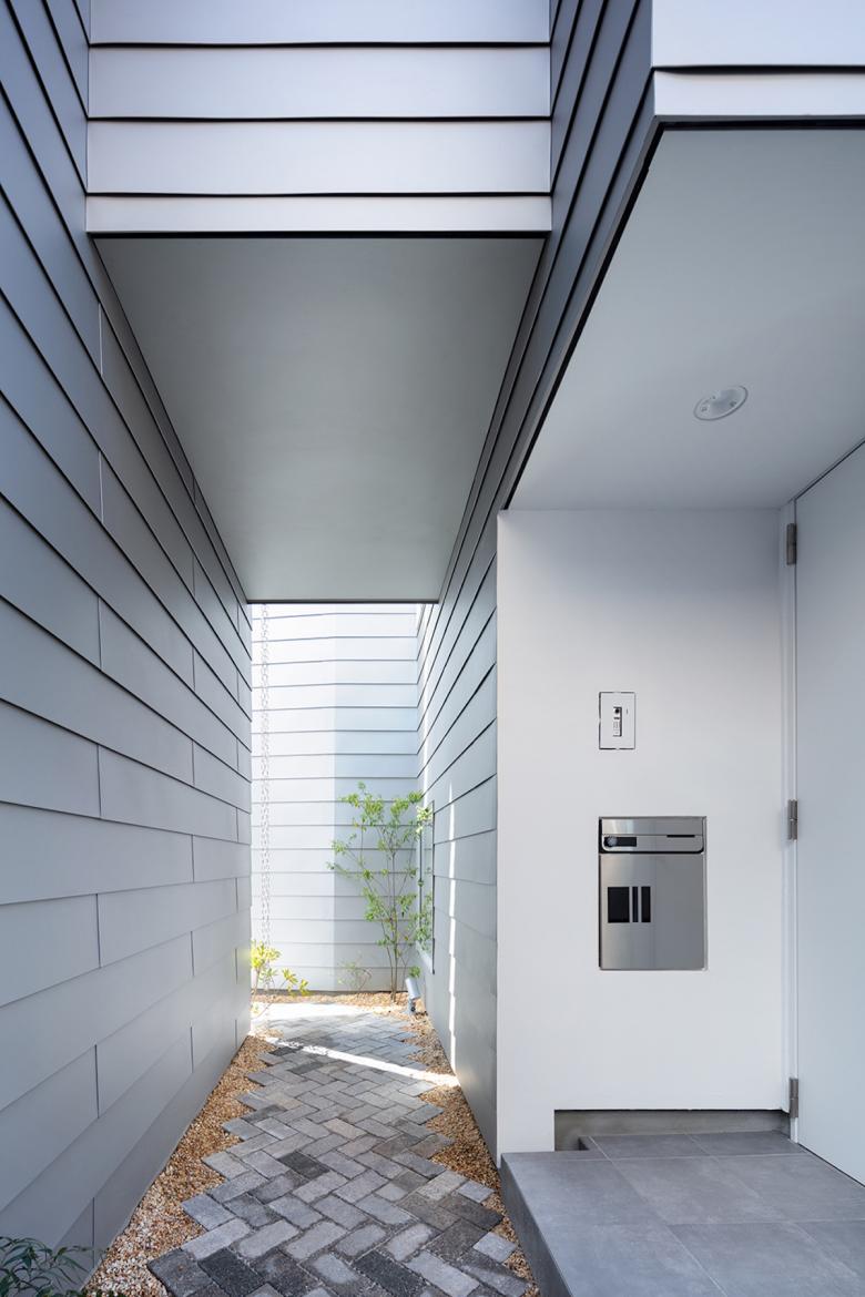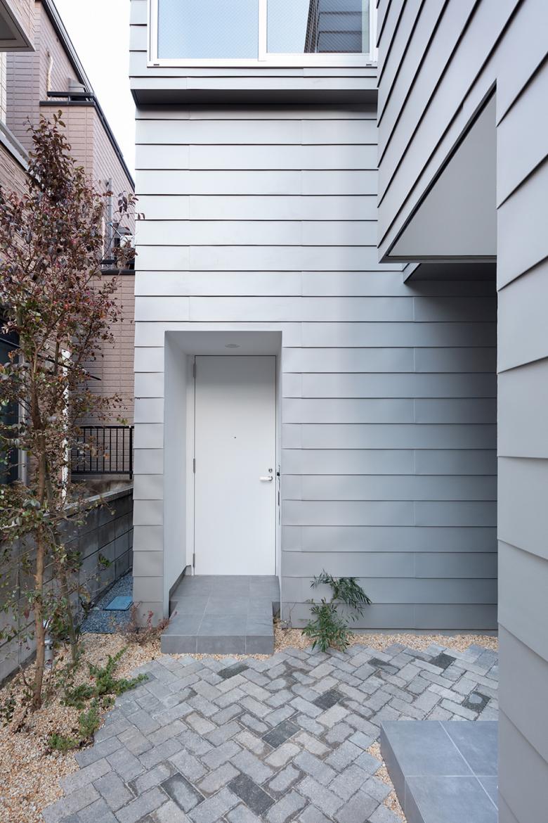 行き止まりの路地はこれに接する数件の住宅に住まう人たちの領域とも言え、半ばプライベートなスペースだ。この路地を敷地内に延長させ、周囲の街並みに倣いインターロッキングを敷き、それに隣接するように3戸のメゾネット住戸を配置した。各住戸は独立性を高めつつ、この路地に様々な仕方で関係し、敷地の奥に行くに従って徐々にプライバシーが高まる状態を模索した。