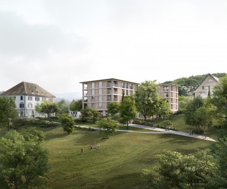 Basierend auf der Lektüre des Ortes wird für das Landgut Wangensbach ein neuer, rechtwinkliger Baukörper mit 14 Ecken vorgeschlagen. Durch Vor- und Rücksprünge werden die Fassadenlängen auf ein Mass reduziert, so dass das Gebäude der im Quartier üblichen Körnung aus Ein- und Mehrfamilienhäusern entspricht. Die verschachtelten Volumen bilden mit dem Landhaus und dem Ökonomiegebäude ein Ensemble. In seinen Einbuchtungen entstehen zusammen mit dem umgebenden Bestand qualitätsvolle Aussenräume.