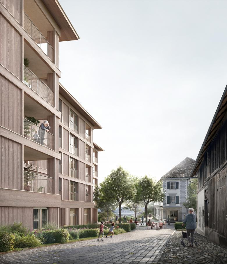 Die Form des Baukörpers resultiert aus der Abschirmung des Lärms der Alten Landstrasse sowie der Orientierung der Wohnungen auf die Aussicht auf See und Berge. So wird zur Strasse hin eine längliche Fassade ausgebildet, welche den Lärm vom Areal abhält. Ein leichter Versatz in der Fassade nimmt den Nebeneingang auf. Zwei Rücksprünge auf der Nordseite sorgen für Ausblick und Besonnung der Wohnungen zum Platz und zum See hin. Die beiden Versätze schaffen zudem eine respektvolle Distanz zum bestehenden Landhaus Wangensbach. Letzterer nimmt auch den Haupteingang am Platz auf. Eine grössere Einbuchtung auf der Südseite schafft gute Wohnräume mit Ausblick auf den See und verortet den Aussensitzplatz des Bistro und des Mehrzweckraumes.