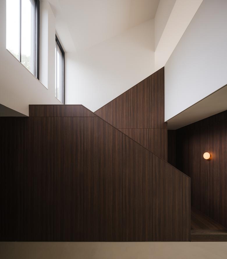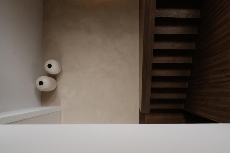 Bereits beim Eintreten eröffnet sich eine räumliche Inszenierung von besonderer Qualität: Das Foyer weitet sich vertikal zu einem großzügigen, nach oben offenen Luftraum. Die skulpturale Treppe sowie ein grafisch gearbeiteter Holzkubus, der als Möbel und architektonisches Element zugleich fungiert, prägen diesen zentralen Ort. So entstehen komplexe, dreidimensionale Raumabfolgen, die Bewegung und Leichtigkeit spürbar machen und das Thema der vertikalen Offenheit eindrucksvoll erlebbar werden lassen.