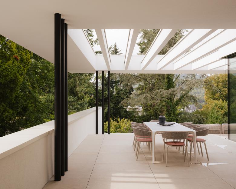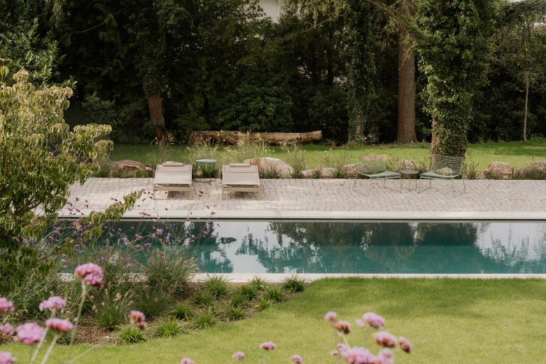 Auch die Landschaftsarchitektur folgt unserem Anspruch, Architektur und Natur organisch zu verbinden. Das natürlich fallende Gelände wurde sanft modelliert und an die Wohnräume herangeführt, um einen direkten Zugang vom Hauptwohngeschoss in den Garten zu schaffen. Der wertvolle alte Baumbestand blieb vollständig erhalten und wurde sensibel in die neue Gestaltung integriert. Durch dieses fein abgestimmte Zusammenspiel aus bestehender Natur und neuer Topografie entstand ein Gartenraum, der den Charakter des Hauses prägt und erweitert.