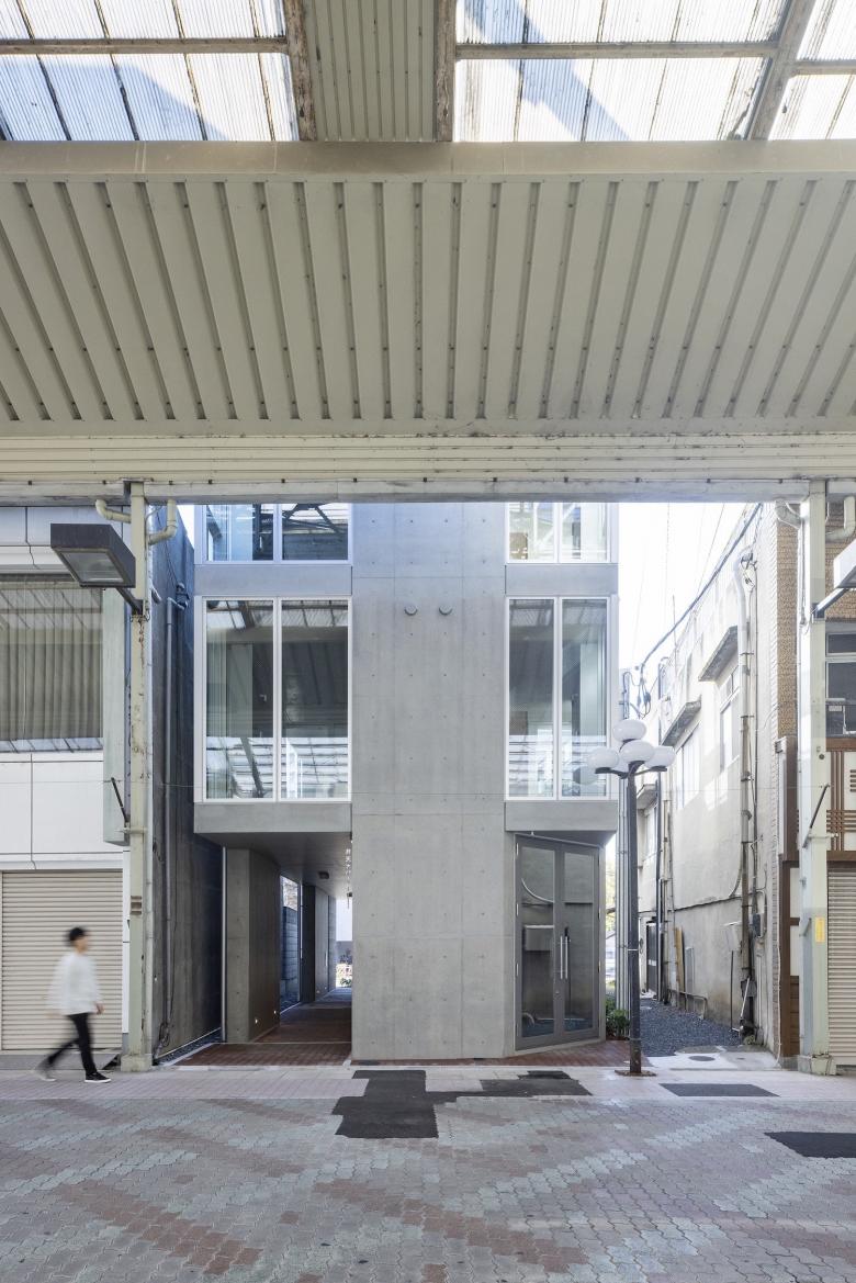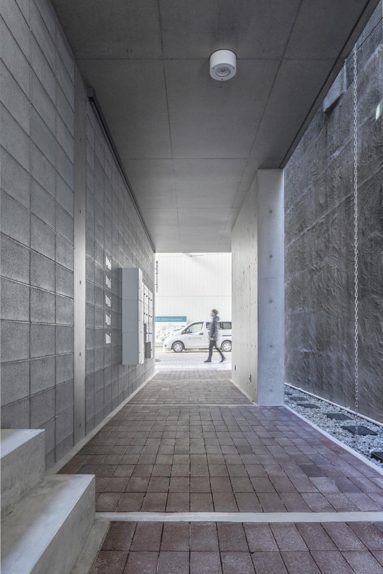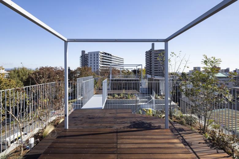 1階はランドリースペースを含む共用部と店舗、2階から4階が住居。2階から分かれる3つの棟の間の階段で屋上緑化されたルーフテラスへ至る。